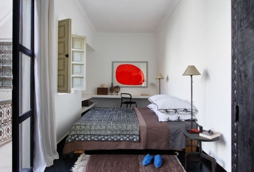 Sekiranya ada impian untuk memiliki tempat tidur yang luas, ini juga mungkin. Anda hanya perlu menyedarinya melalui pemodenan, fleksibiliti atau penataan perabot lain. Luas almari untuk pakaian juga senang diletakkan, anda hanya perlu memilih bentuk yang optimum untuknya. Meja solek diperlukan. Sebagai alternatif, anda boleh melakukan dua dalam satu: meja sebelah katil + meja.