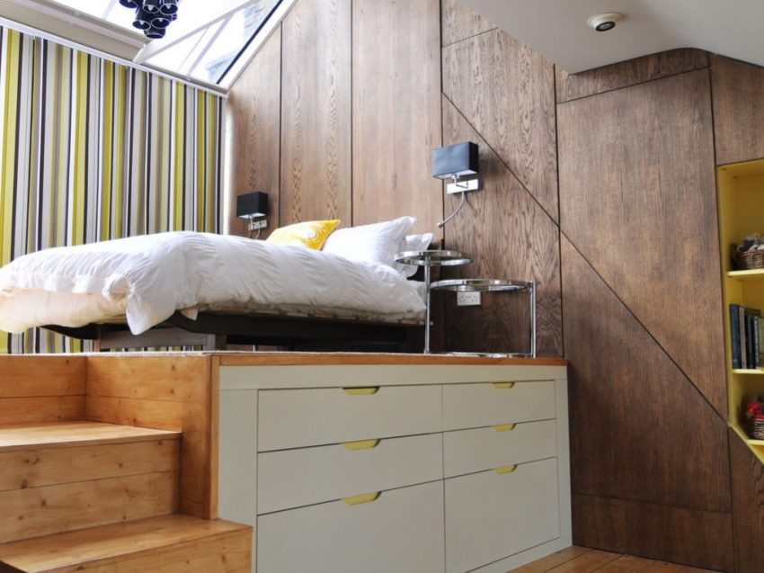 Penyelesaian yang baik untuk menjimatkan ruang di bilik tidur adalah penggunaan tempat tidur podium dengan laci