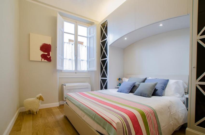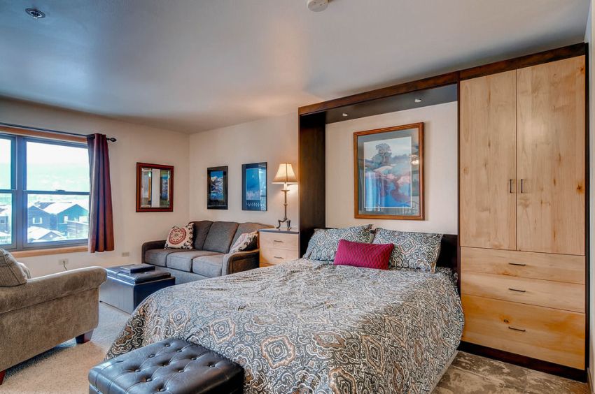 Di bilik tidur kecil, disarankan untuk meletakkan perabot kabinet dari lantai ke siling