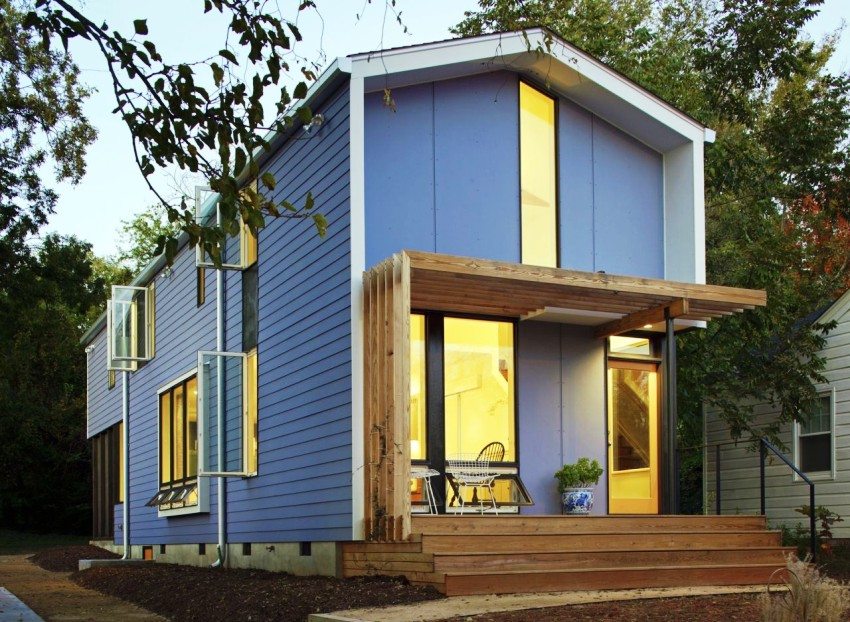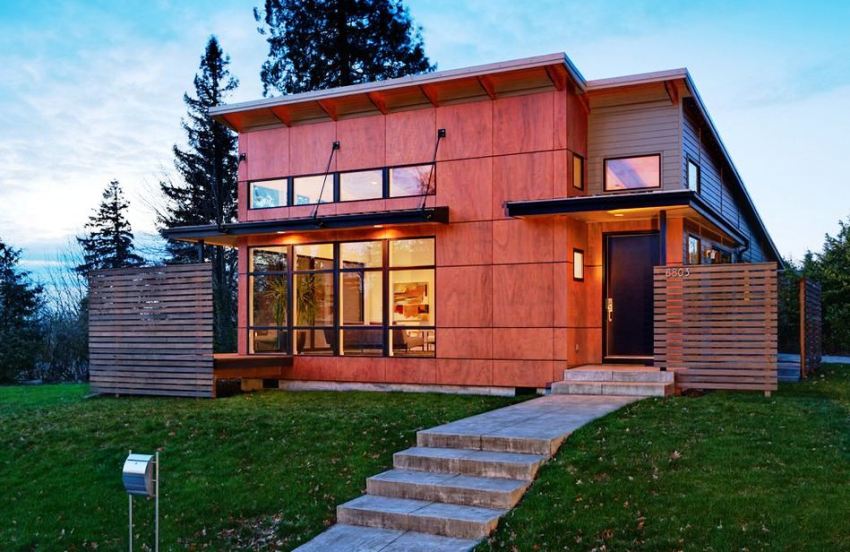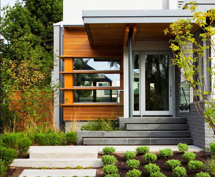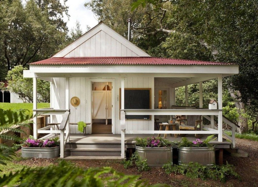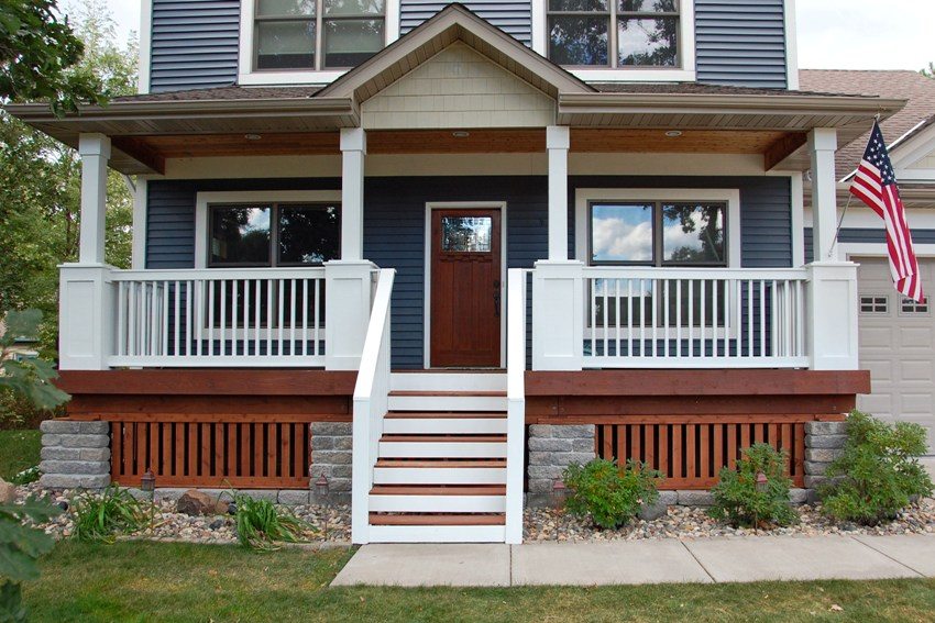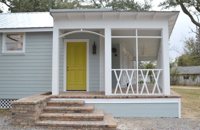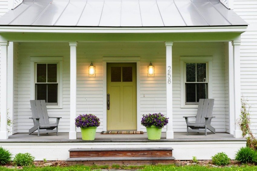 En åpen veranda brukes ofte når man ordner forstads- eller landsteder... Den kan være åpen eller utstyrt med et lite visir. Den kan utstyres med originale kolonner. I dette tilfellet vil det skille seg ut på bakgrunn av hele huset.