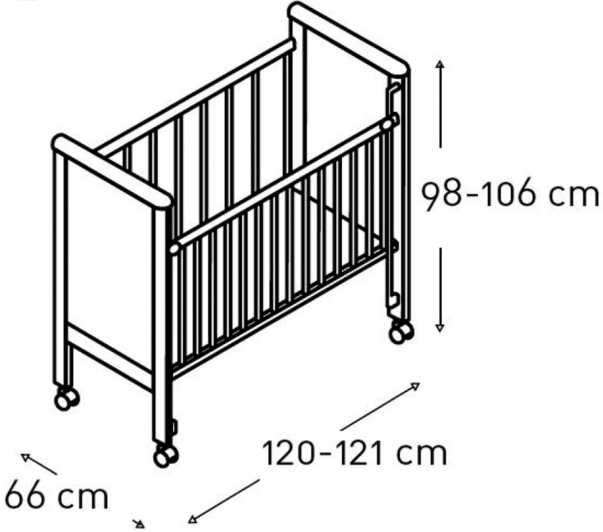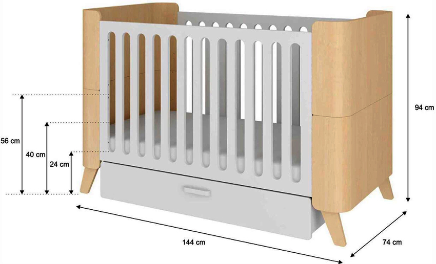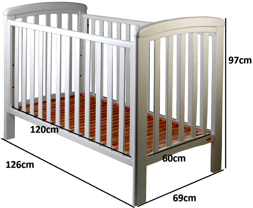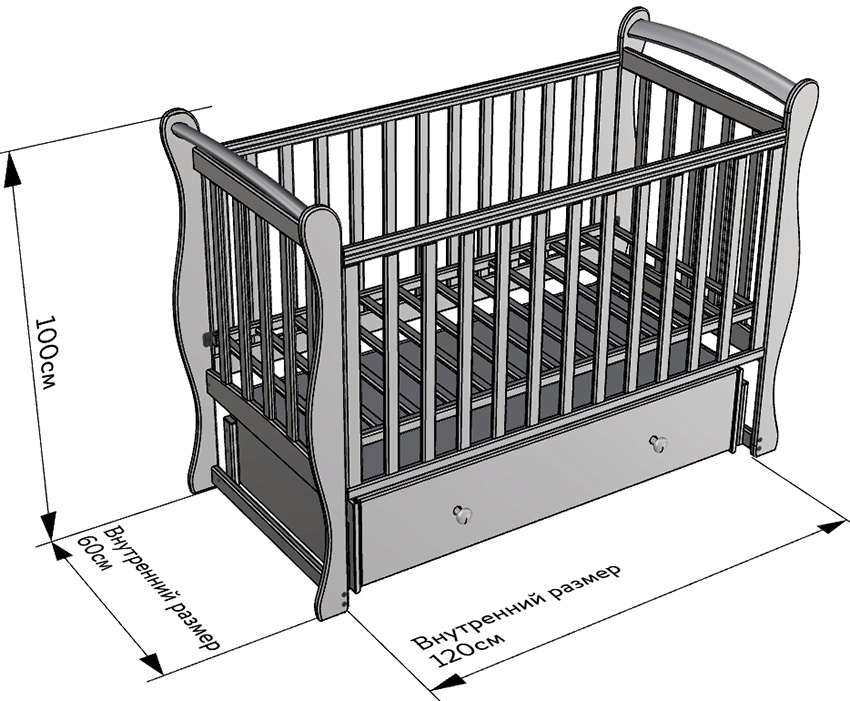 Sengestørrelsen for en nyfødt i standard design er 60x120 cm. Sideveggene kan tas av. Sengens høyde i forhold til gulvet kan endres, slik at den kan tilpasses barnets alder. Gjør-det-selv-enkeltseng barneseng har en bredde på 70 cm og en lengde på 130 cm. Designet er utført med beskyttende gjerder som kan fjernes. Dimensjonene på skyvesenger, hvis enhet lar deg endre størrelse med veksten av barnet, kan nå en lengde på 160-170 cm.