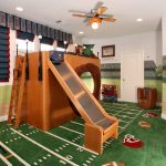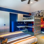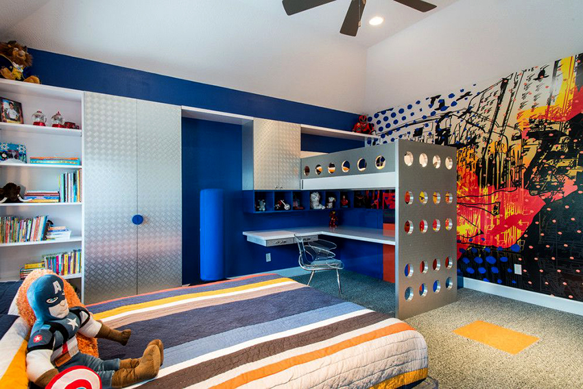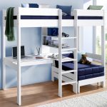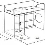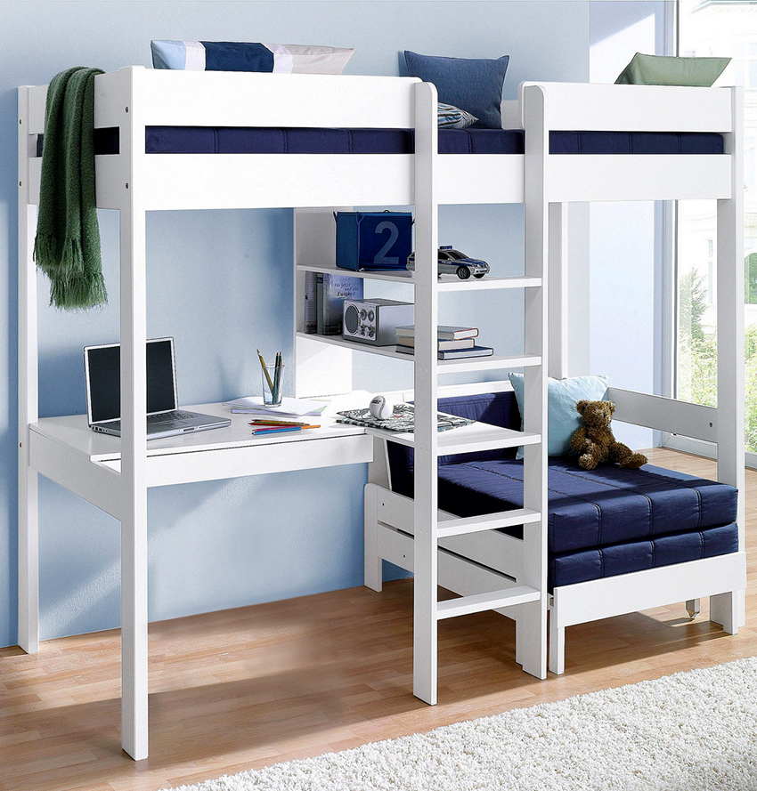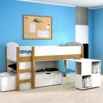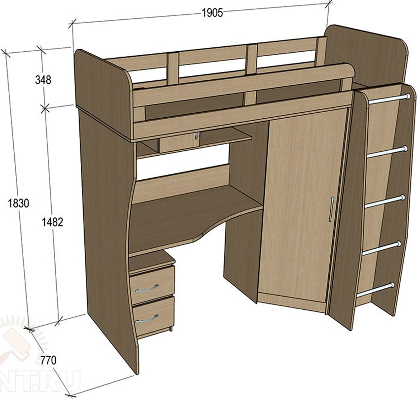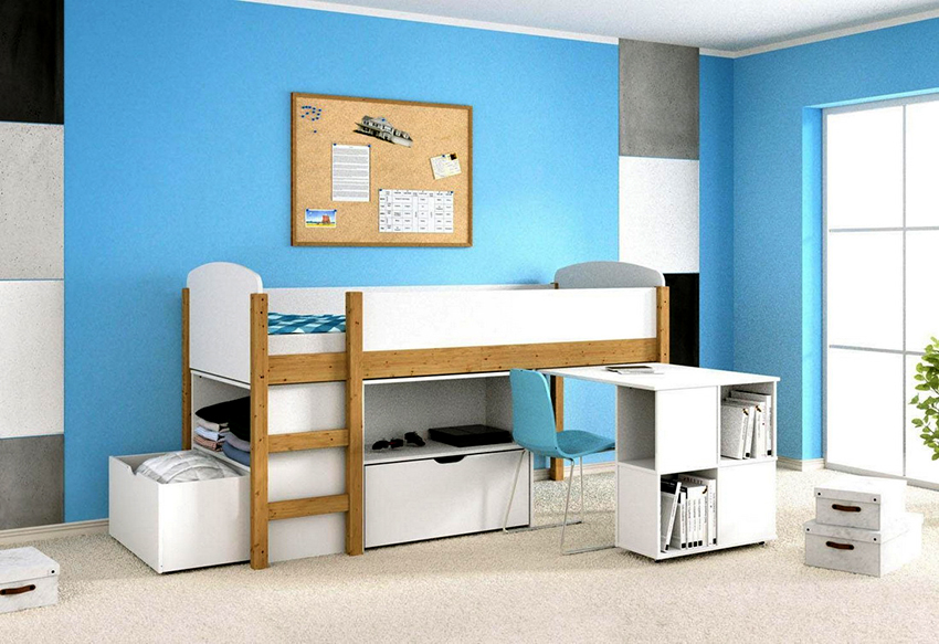 Det resulterende rektangulære sengeplassen kan deles ved hjelp av horisontale og vertikale skillevegger i alle soner med skuffer og åpne hyller. Her er det ønskelig å sette skrivebord, bordplate som er laget av laminert sponplate. Dette er bare mulig med tilstrekkelig køyehøyde. Et av sidepanelene i strukturen vil tjene som en støttepunkt. Ulike alternativer vises på bildet av gjør-det-selv-barnesenger laget av tre.