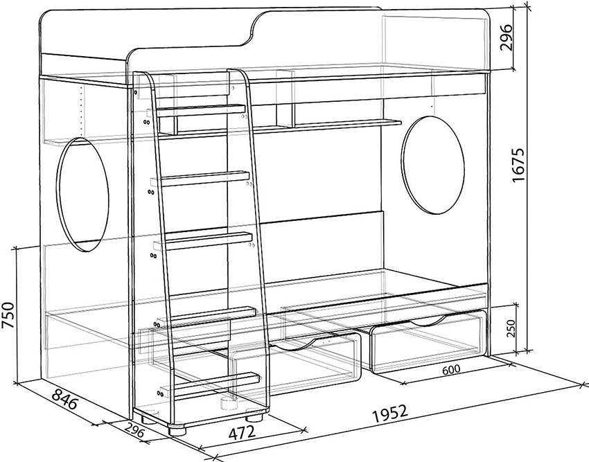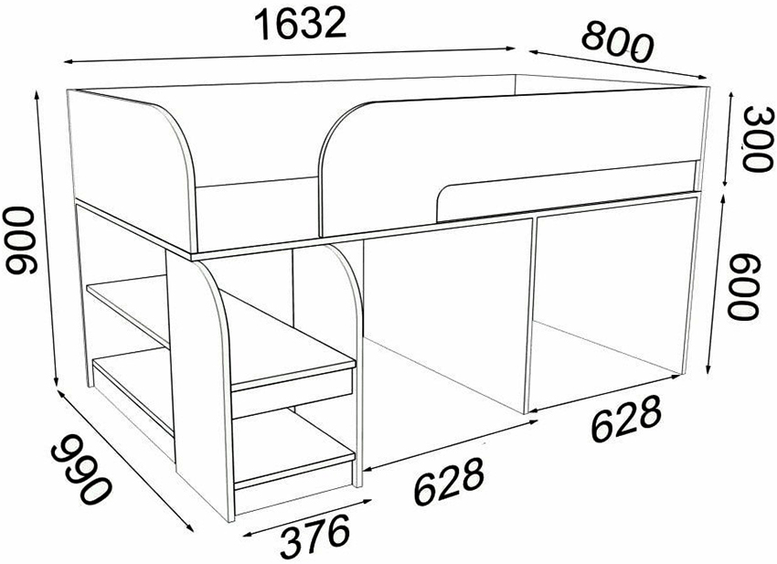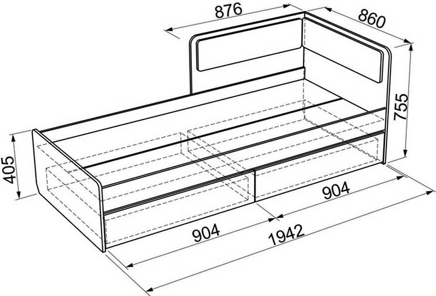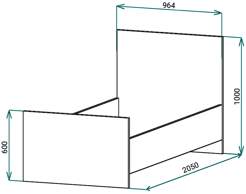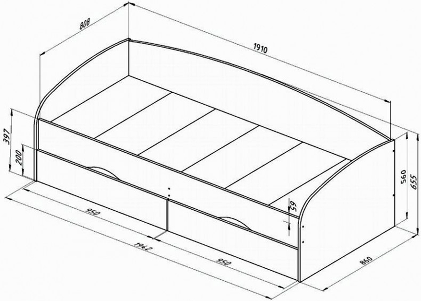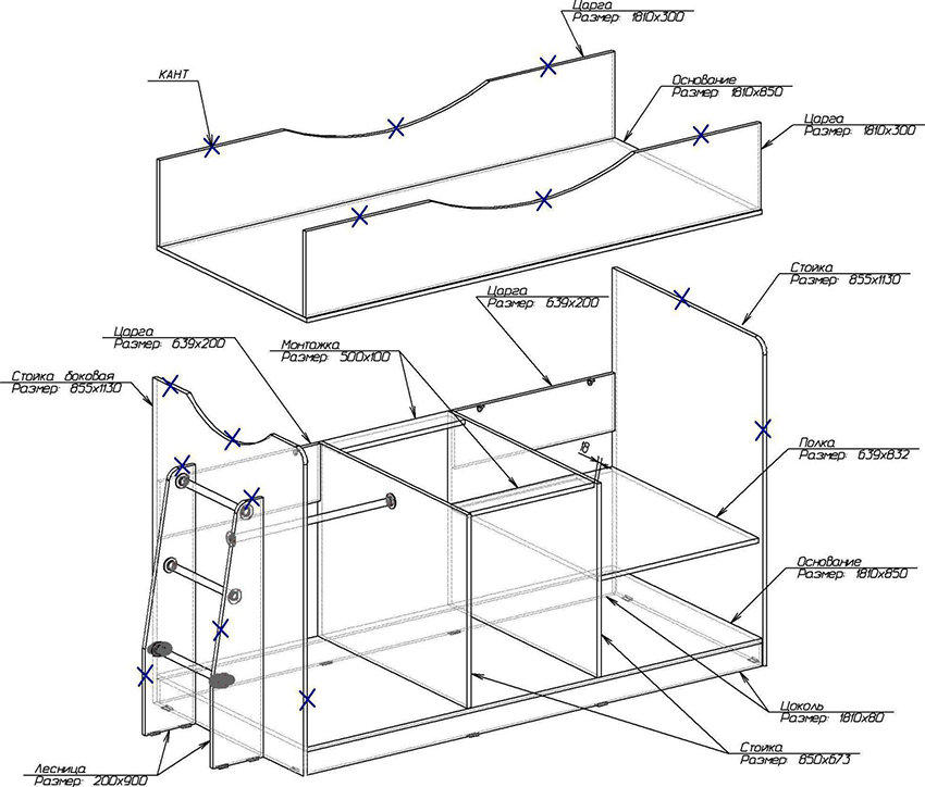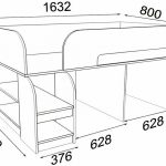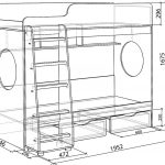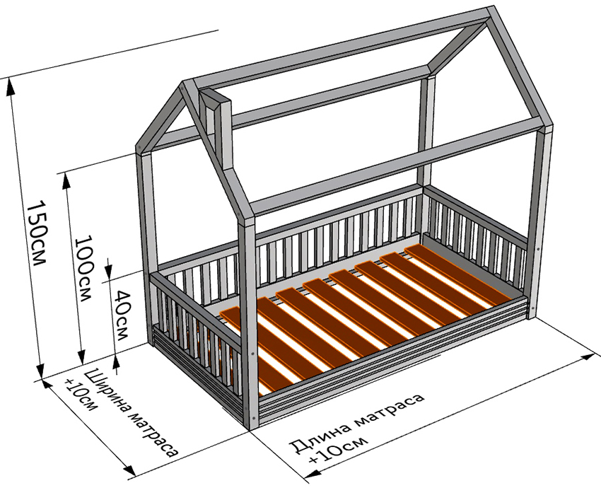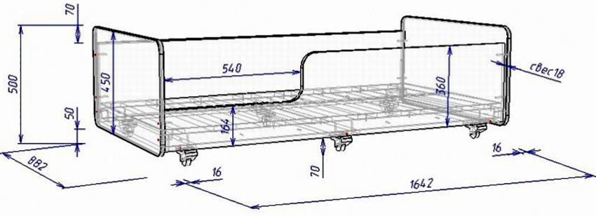 Strukturen til strukturen for barnet inkluderer en base og ryggstøtter, noe som er tydelig vist på tegningen av sengen. Produktets bredde og lengde bestemmes madrass dimensjoner... Bunnen av sengen skal ikke være mer enn 35 cm fra gulvet slik at barnet enkelt kan klatre opp på det.