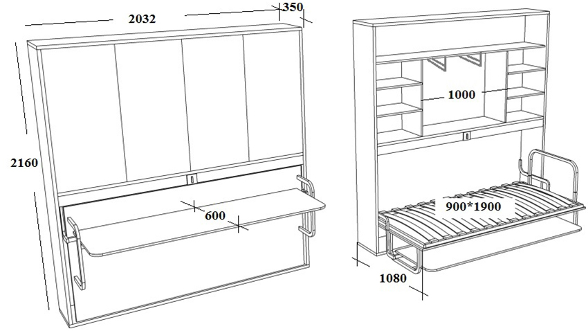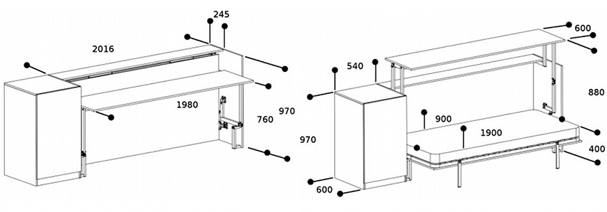 Løftemekanismen kan lages uavhengig av trager med lagre eller fra garasjegardiner. Et mer pålitelig alternativ er å kjøpe et fabrikksett. Mekanismen må festes til boksen og soveplassen.Forsiden av sengen i oppreist stilling kan dekoreres under en garderobe med imiterte dører med håndtak eller skape en monolitisk speilflate.