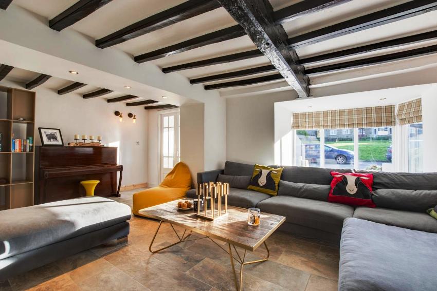 Stuen har også betydning. Sofaen må velges med tanke på størrelsen på rommet. En massiv struktur med store dimensjoner bør ikke installeres i et lite rom, da det vil forstyrre bevegelsen.