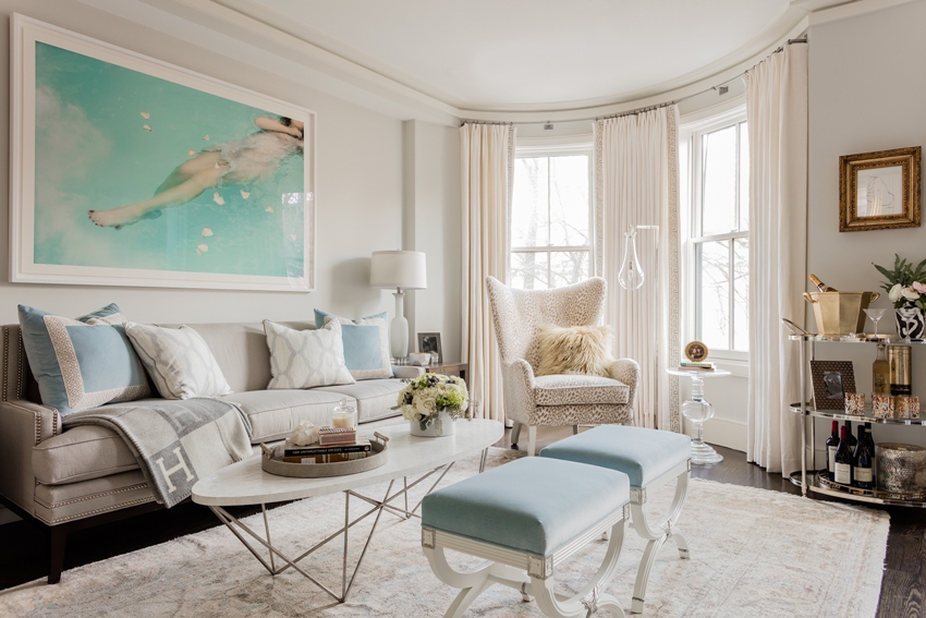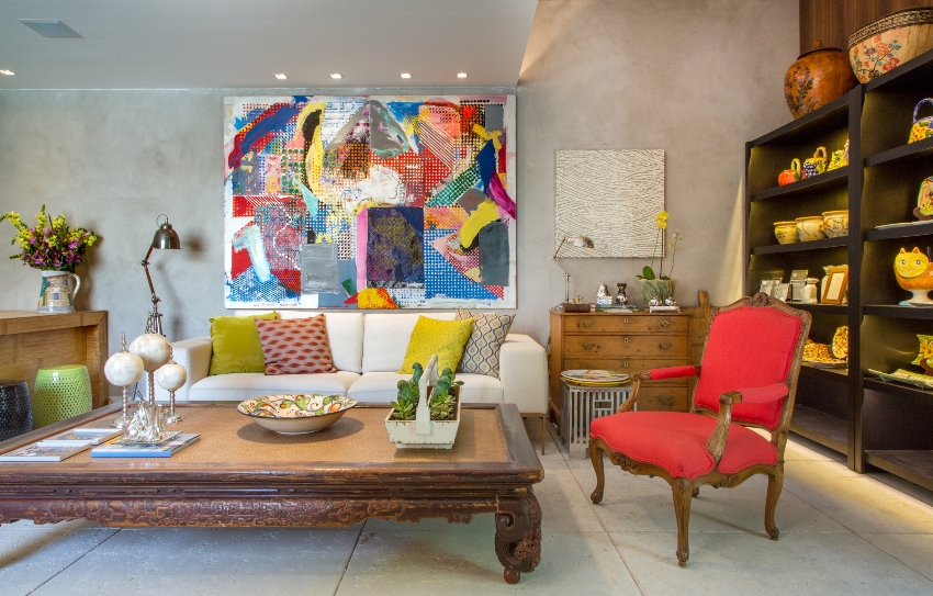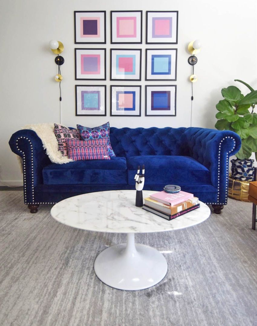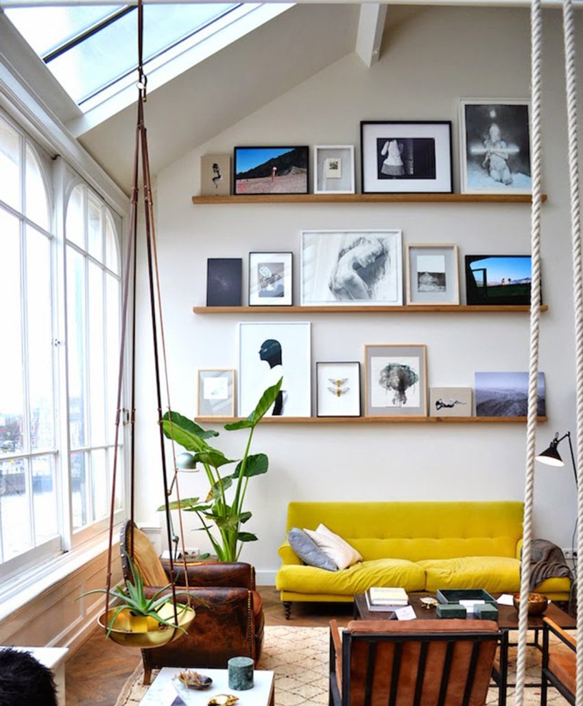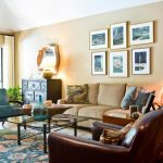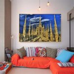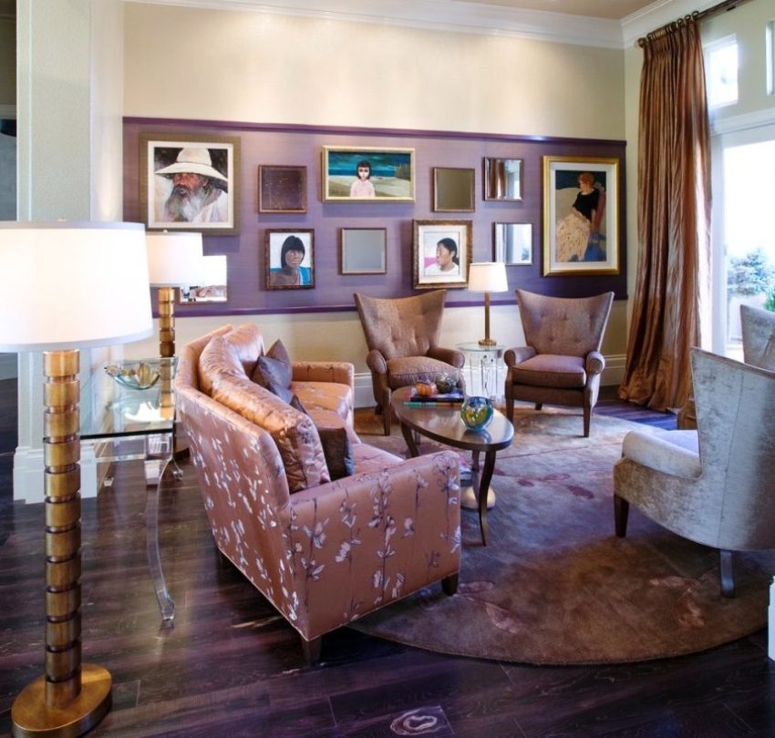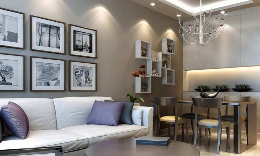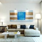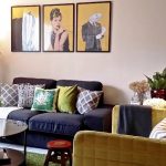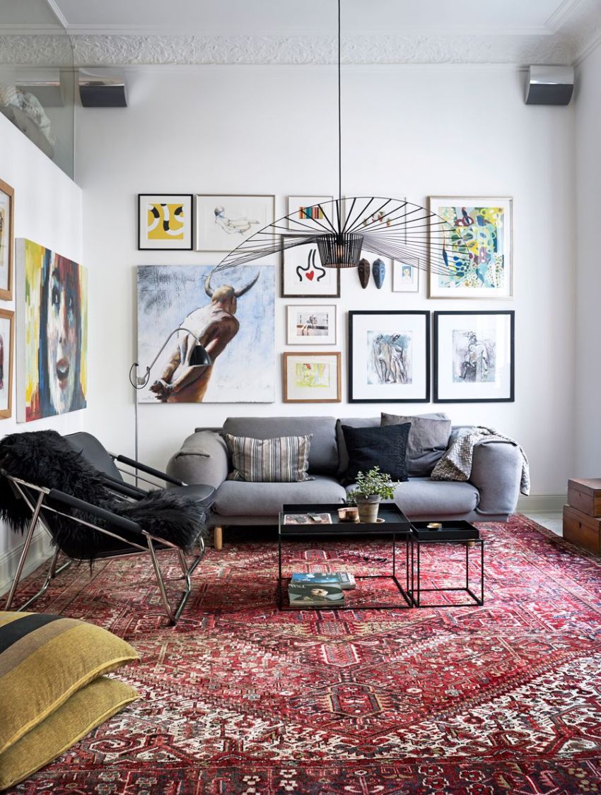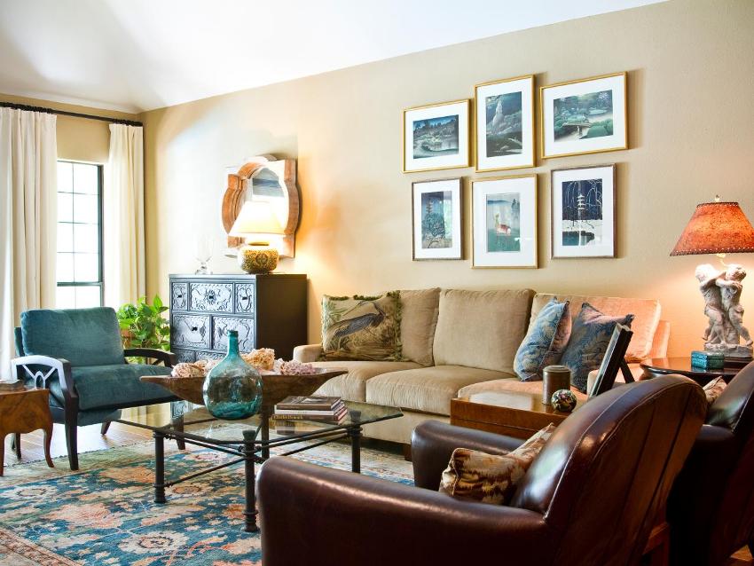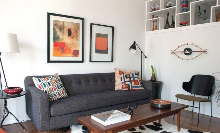 Komposisjoner bestående av flere malerier, plakater eller fotografier skal oppta et rom på veggen som tilsvarer 1/3 av sofaens bredde. Ellers vil ikke innredningen se harmonisk og komplett ut.