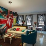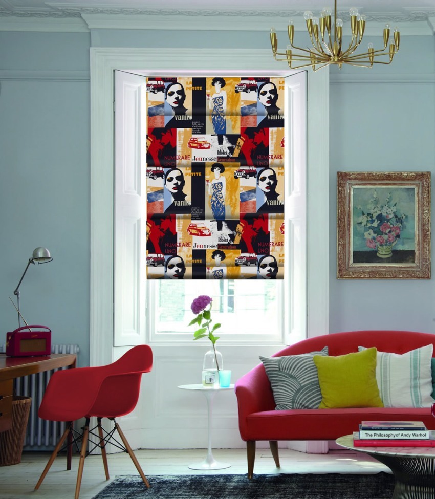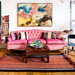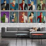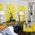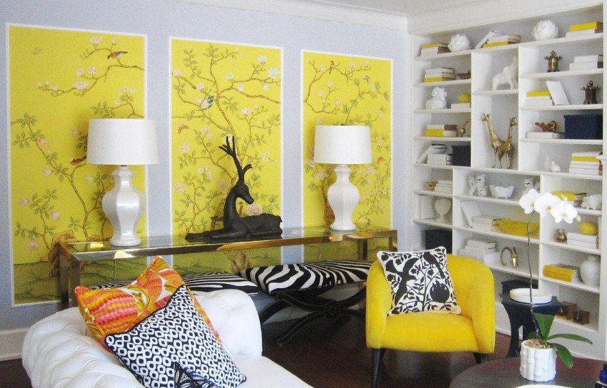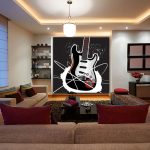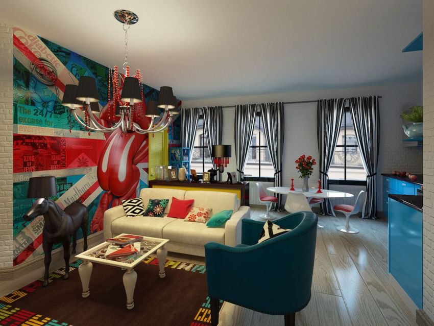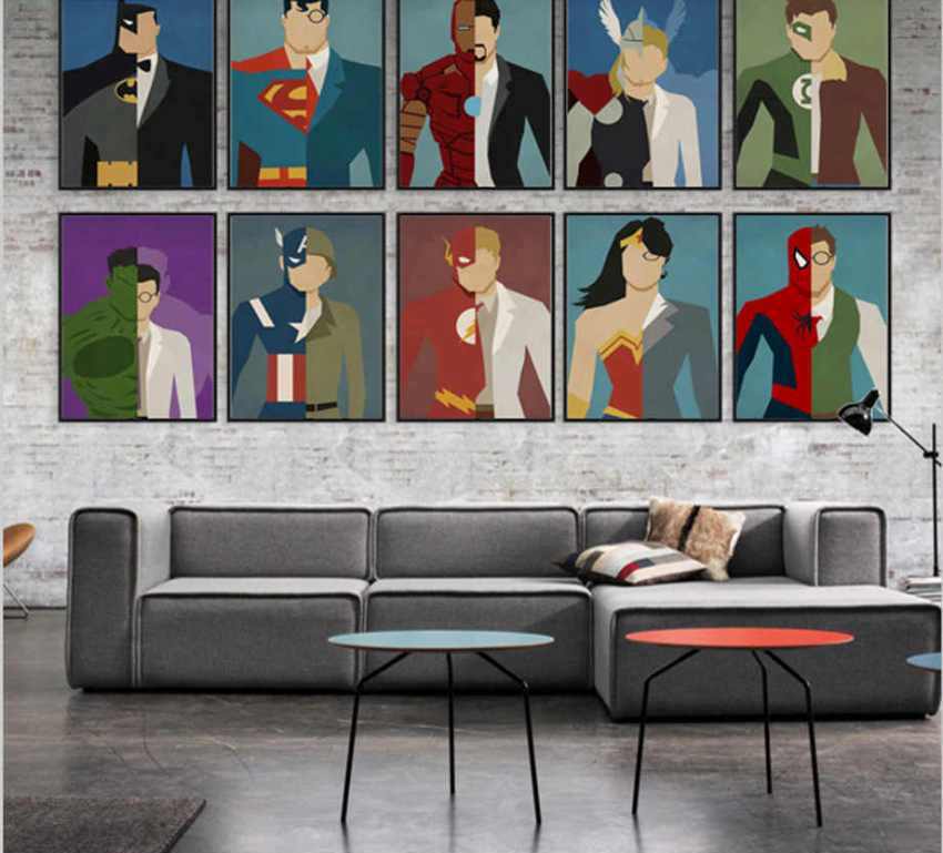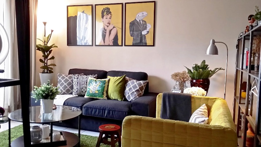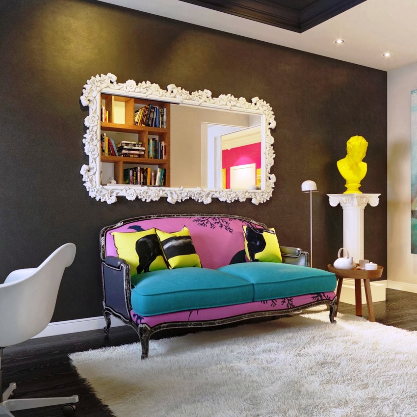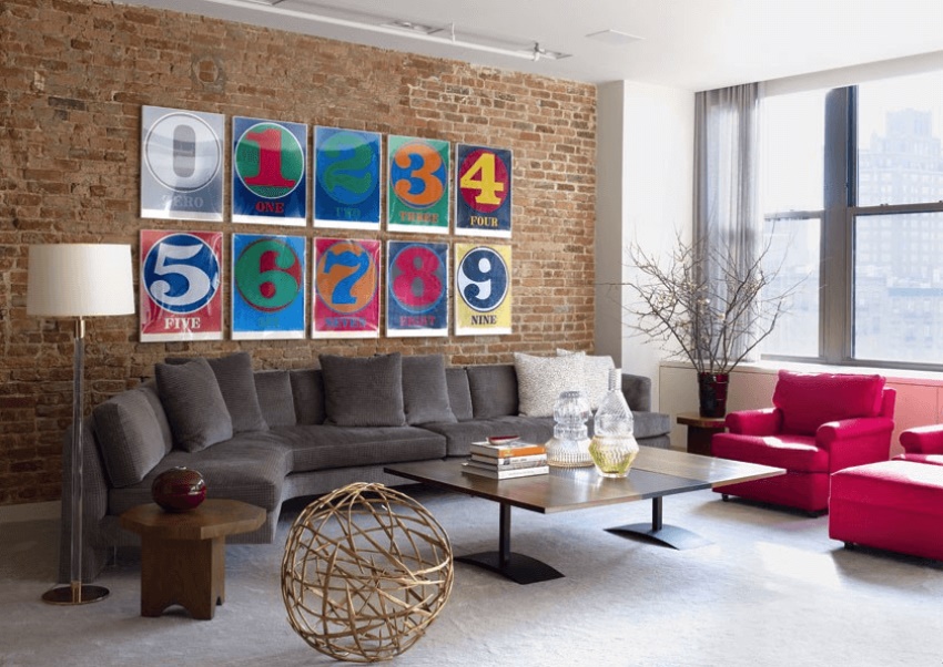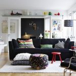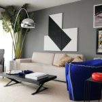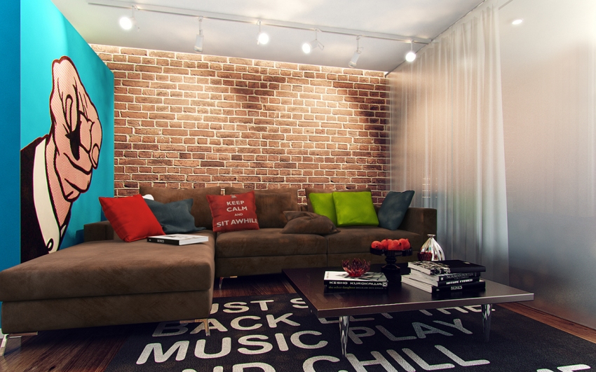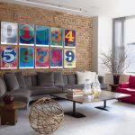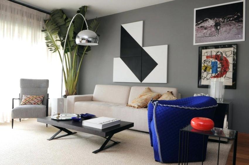 Hvis det indre av stuen ikke er stivt knyttet til en bestemt stil, kan veggen bak sofaen dekoreres med plakater eller plakater. De kan ha hvilken som helst farge. Denne typen innredning passer godt til stiler som loft, popkunst og skandinavisk stil.