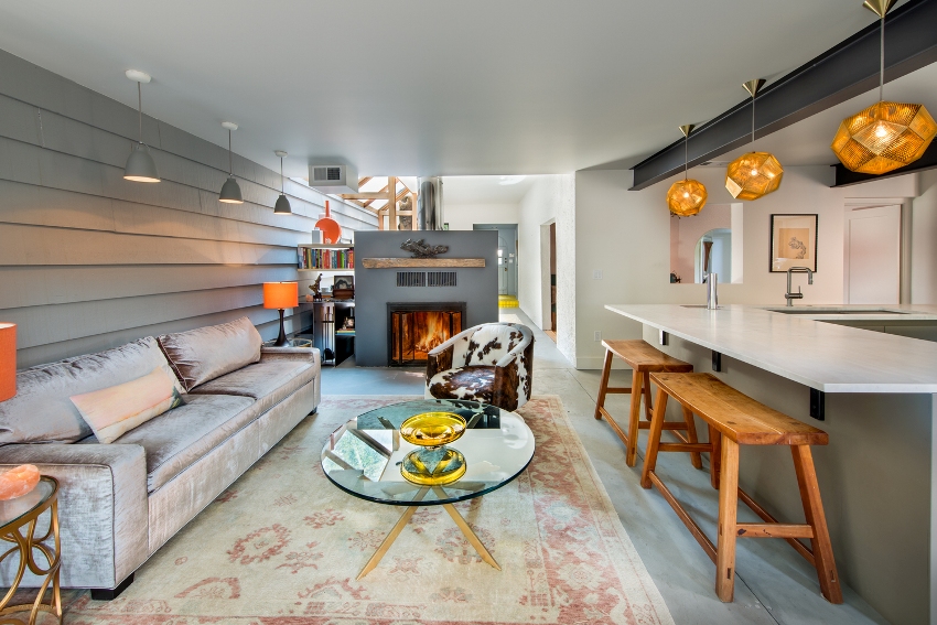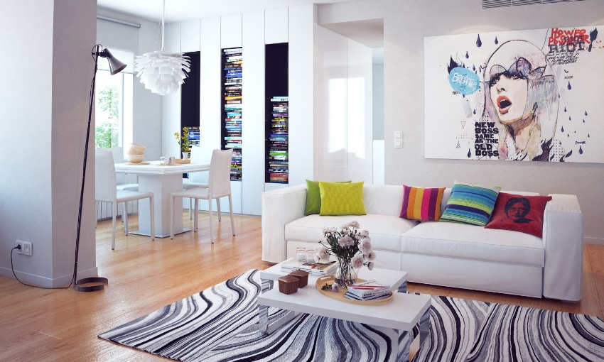 For å visuelt utvide rommet, kan du bruke fototapet som dekor for veggen bak sofaen. Lerret med effekten av dybde vil huskes av gjestene i lang tid.