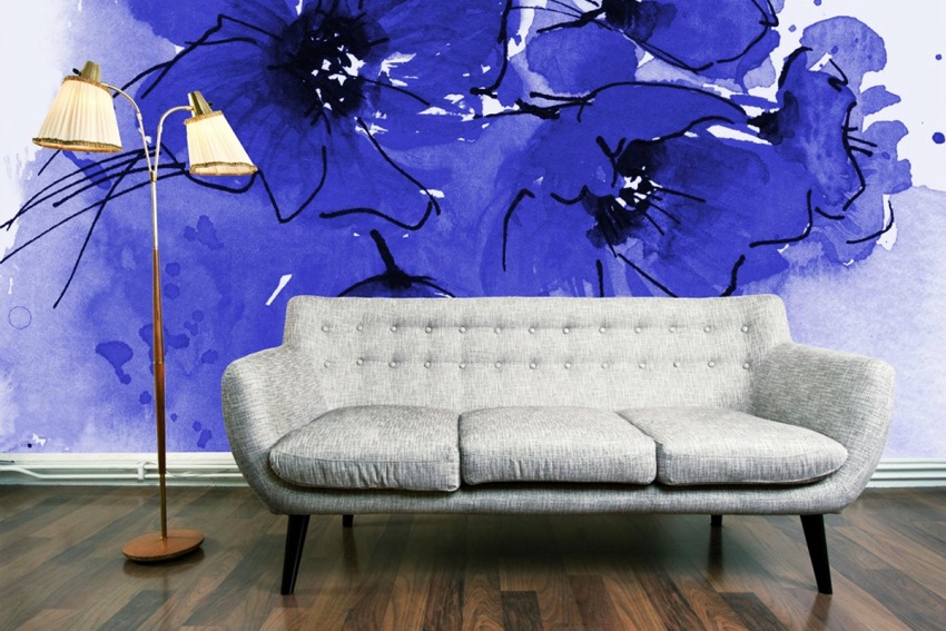 Veggen bak sofaen kan dekoreres med dekorative bakgrunnsbilder med forskjellige bilder, som støtter en viss interiørstil: