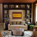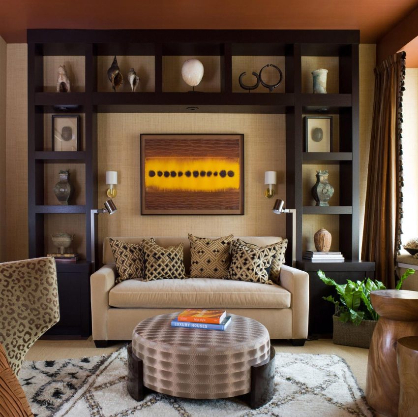 For å fylle rommet over sofaen, bør du bruke bokhyller i forskjellige former og farger, gamle eller moderne geografiske kart, lamper, tallerkener, klokker, speil, opplyste nisjer, temadekor, for eksempel masker, dyrehud, musikkinstrumenter osv.
