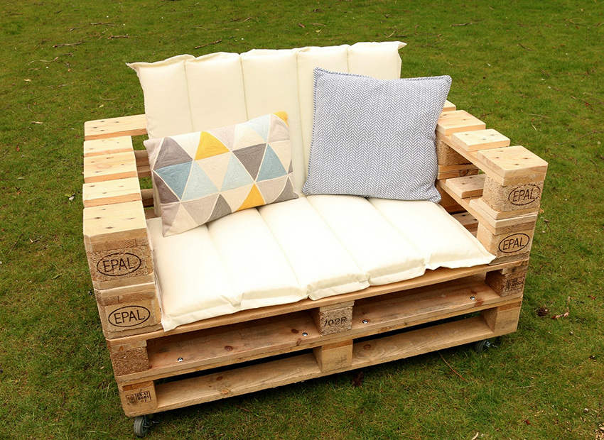 Det er også enkelt å lage en fin og behagelig tresofa av paller. Dette vil kreve to paller, negler, en sag, en bor, noen planker og sandpapir. Det er best om pallene til setet og ryggstøtten er av samme størrelse.