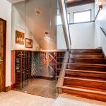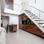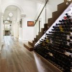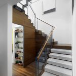Tilstedeværelsen av glass i skapet under trappen hindrer støv i å sette seg på hyllene og fungerer som et element av spektakulær design