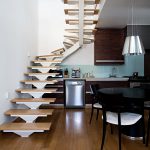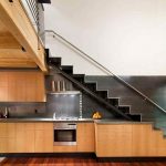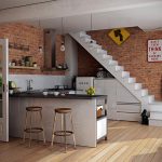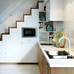 Plassen under trappene i et lite herregård kan effektivt brukes til å organisere et arbeidsområde der maten skal tilberedes. Dette designalternativet lar deg spare plass i huset for å skape et ekstra rom, for eksempel en stue eller et soverom.