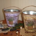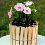 Gjør-det-selv lave blomsterpotter kan opprettes fra bokser og klesklyper av tre som er festet rundt beholderens omkrets. Innredningen kan være intakt eller malt i forskjellige farger. På en lignende måte kan du ordne en boks med fargeblyanter, binde den med hyssing eller bånd.