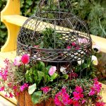 Denne unike hengekomposisjonen er hentet fra et fuglebur som brukes som planter. Dette alternativet er egnet for korte planter. Buret kan spraymales og enhver dekor kan gjøres.