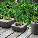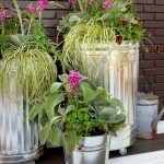 Ved hjelp av hule askeblokker lager de ofte et blomsterarrangement for hagen, og bygger elementer i form av en pyramide eller tårn, som vist på pottebildet. Du kan legge originaliteten til blomsterpottene ved å belegge overflaten på produkter med maling. En plantepotte kan lages av en vanlig søppelboks, som er laget av skinnende materiale. Roterende møbelhjul er festet til bunnen av produktet for muligheten for bevegelse.