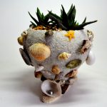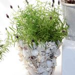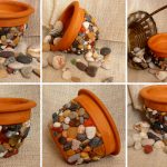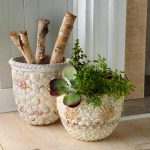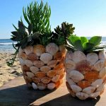 Ved hjelp av skjell og småstein kan du gi marine motiver liv. For dette må overflaten på potten og dekorasjonselementene avfettes. Skjellene er festet til blomsterpotten med hurtigtørkende lim. De resulterende hulrommene er fylt med sand som påføres PVA.