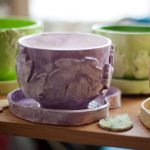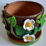 Bunnen og stripen er slått sammen for å danne en blomsterpotte. Alle skjøter glattes ut for å oppnå en jevn, glatt overflate. Prosessen utføres ved å fukte fingrene med vann. Den ferdige leireblomsterpotten skal tørke naturlig i 48 timer. Avslutningsvis er blomsterpotten malt i flere lag med en etterbehandlingslakk.