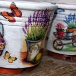 En vanlig teknikk for å lage en blomsterpotteinnredning er decoupage. For å gjøre dette trenger du spesielle servietter med et vakkert ornament, lim, hvit akrylmaling og lakk, en flat børste og en gryte. Hvit maling påføres overflaten av blomsterpotten i flere lag. Fjern topplaget fra decoupageservietten. Tegningen overføres til overflaten av blomsterpotten, festet i den med en klebende sammensetning. Lerretet jevnes med en børste. Etter fullstendig tørking lakkeres overflaten.
