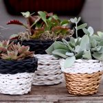 En blomsterpotte, vevd av kvister, ser uvanlig og original ut. For å gjøre det trenger du tynne, jevne kvister, et garnnøst, et stykke burlap, en sylindrisk blikkboks og lim.Stengene er flettet sammen og bundet med hyssing etter prinsippet om en matte. Boksen er smurt med lim, på hvilken burlap er festet. Etter fullstendig tørking pakkes produktet inn i en matte som festes med hyssing.