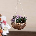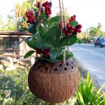For planter som ikke trenger hyppig vanning og ampel-varianter, er en hengende kokosnøttpott et godt alternativ. For å gjøre det, må mutteren kuttes i to, og fjerne massen fra den. Dette skaper to potter. Det skal lages flere hull i den nedre delen av hver halvdel ved hjelp av en dreneringsbor. For å suspendere strukturen lages det også reir på begge sider av skallet.
