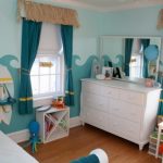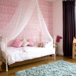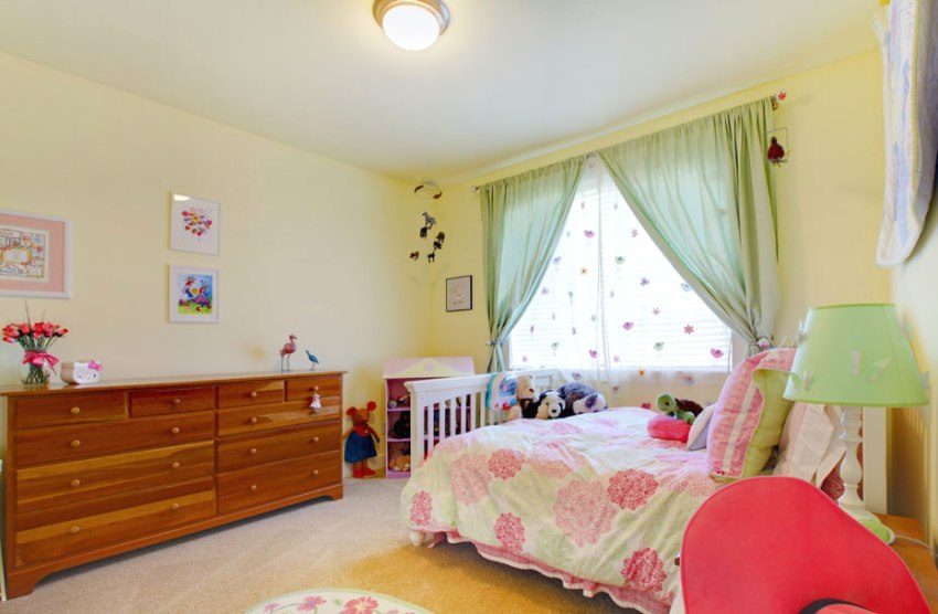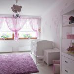 Teppe og gardiner i barnehagen til en jente: bilde av tekstildekorasjon