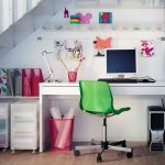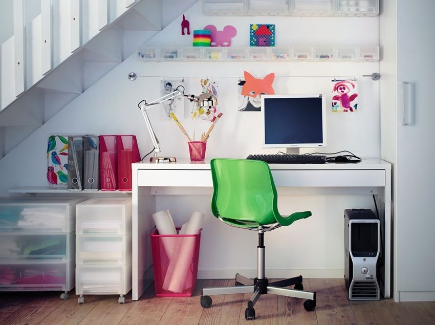 Endringene vil også påvirke arbeidsplassen og treningsstolen. Skrivebordet skal allerede ha et sted å plasseres på overflaten av en datamaskin eller bærbar PC, lydhøyttalere, en skriver, bøker, fotorammer, personlige eiendeler til et barn. For å sitte er det bedre å velge en datamaskinstol med justerbare ben og rygg.