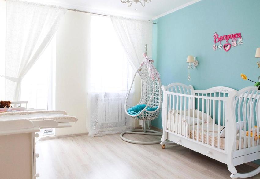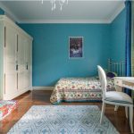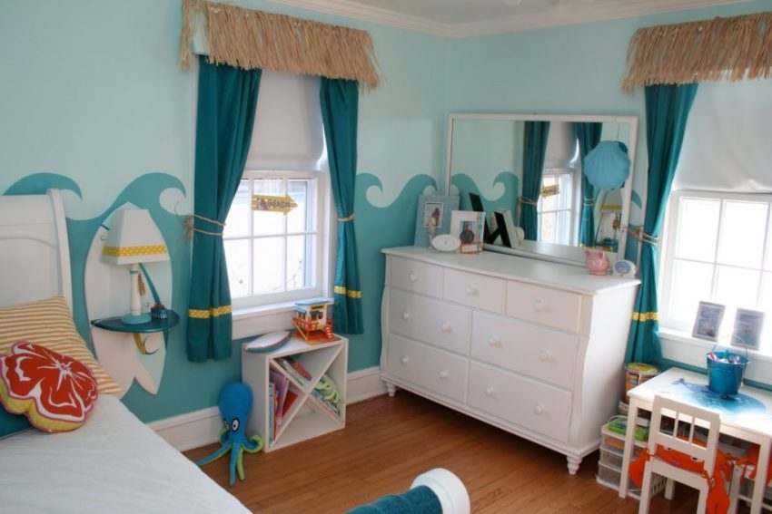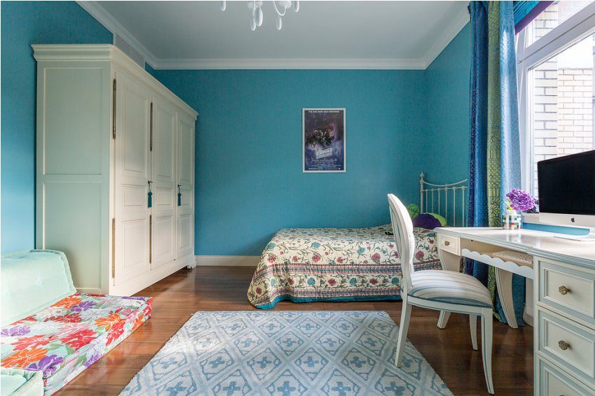 Ofte brukes en blå fargetone til å dekorere et rom for en jente, både som hovedfarge og et ekstra fortynningsfargeskjema. Den blå fargen har mange nyanser (himmelblå, lys turkis, ultramarin, gråblå, mentol), og enhver kombinasjon av dem ser spektakulær ut.