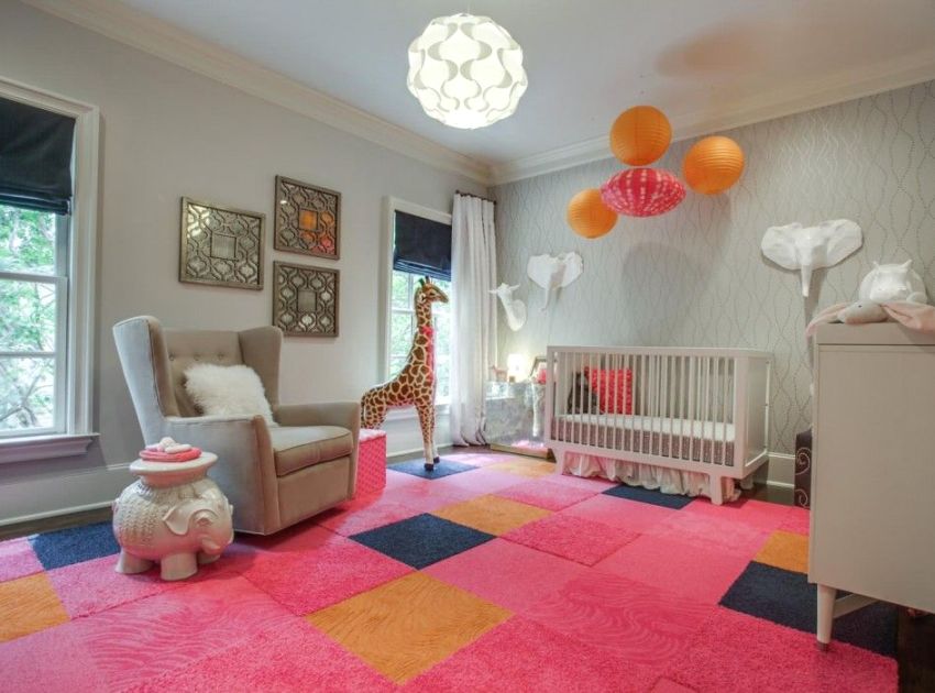 Teppe er et obligatorisk attributt i barnas, siden mest av alt barnets spill og tidsfordriv foregår på gulvet. Du kan kjøpe et standard størrelse teppe til barnehagen din, eller kjøpe noen få små tepper. Sistnevnte ser kreative og uvanlige ut i utformingen av rommet, og kan være forskjellige i form og farge. En jente kan dra et slikt teppe til stedet der hun er nå. For spill med kjærester kan mini-tepper spille rollen som øyer, hvor hver vil ha sitt eget "hus".