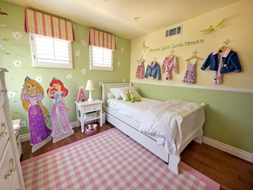 Nyttige råd! Mal veggene i rommet med en solid lys (beige, melkeaktig eller myk kaffe) farge. Etter hvert som jenta vokser opp, kan de dekoreres med forskjellige alternativer - kunstnerisk maleri, tegninger av barnet selv, fargede håndavtrykk, malerier, rammer med speil, klistremerker med karakterer fra favoritttegneseriene eller eventyrene dine, etc.