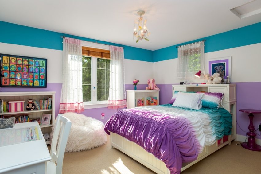 Kombinasjonen av kontrasterende nyanser i utformingen av rommet vil appellere til jenter i skole- og ungdomsskolealder.Fletter av mørke mettede toner - svart, dyp lilla, havbølge - ser spektakulære ut i interiøret. En kontrasterende aksent kan være en av veggene i rommet, gardiner på vinduene, et møbelelement, en innerdør osv.