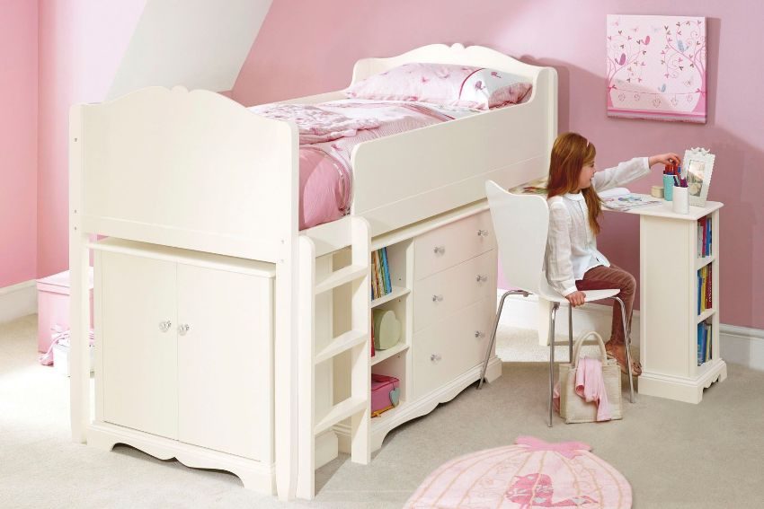 Nyttige råd! Vær oppmerksom på modellene av senger med en avtakbar oppbevaringsboks. Du vil ikke angre hvis du bestemmer deg for å kjøpe møbler i et barnehage til en jente av denne typen, fordi det er veldig praktisk og funksjonelt, og sparer også ledig plass.