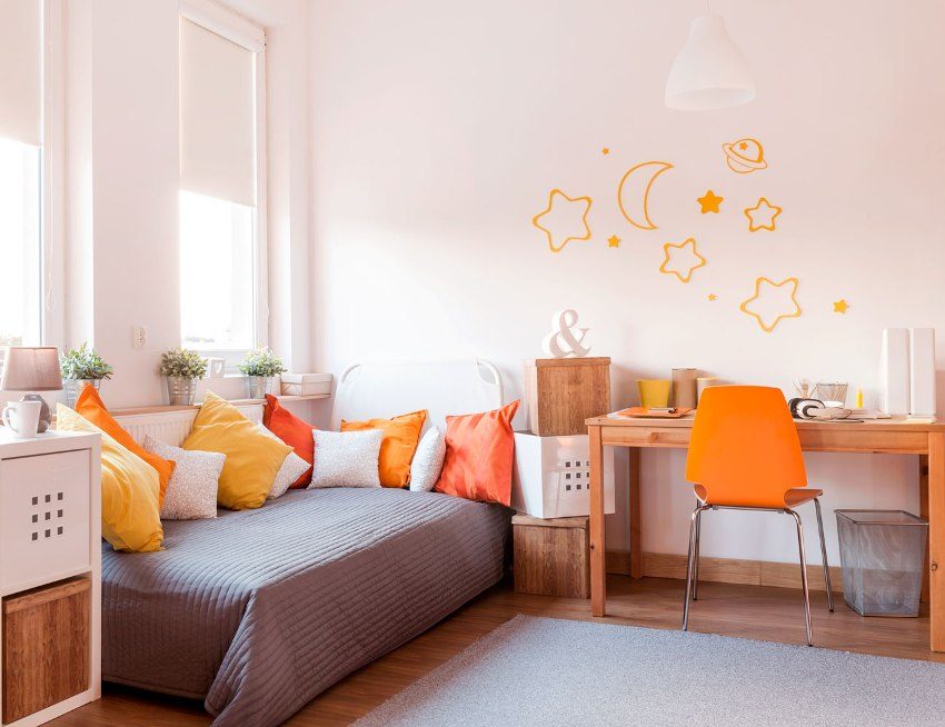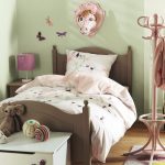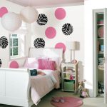 Du kan dekorere dørene og veggene til et rom med innvendige klistremerker, som presenteres i det bredeste sortimentet på markedet - disse kan være sommerfugler, dyr, blomster, stjerner, krøller, mønstre. Hvis et barn tegner, kan det lage sitt eget kunstverk på veggen. Som du kan se på bildet av barnerom, bruker tenåringsjenter sine sett med klær festet på veggen eller kledd på utstillingsdukker for ekstra dekorasjon.