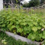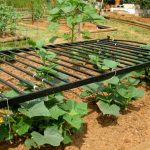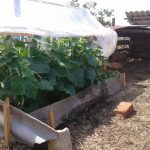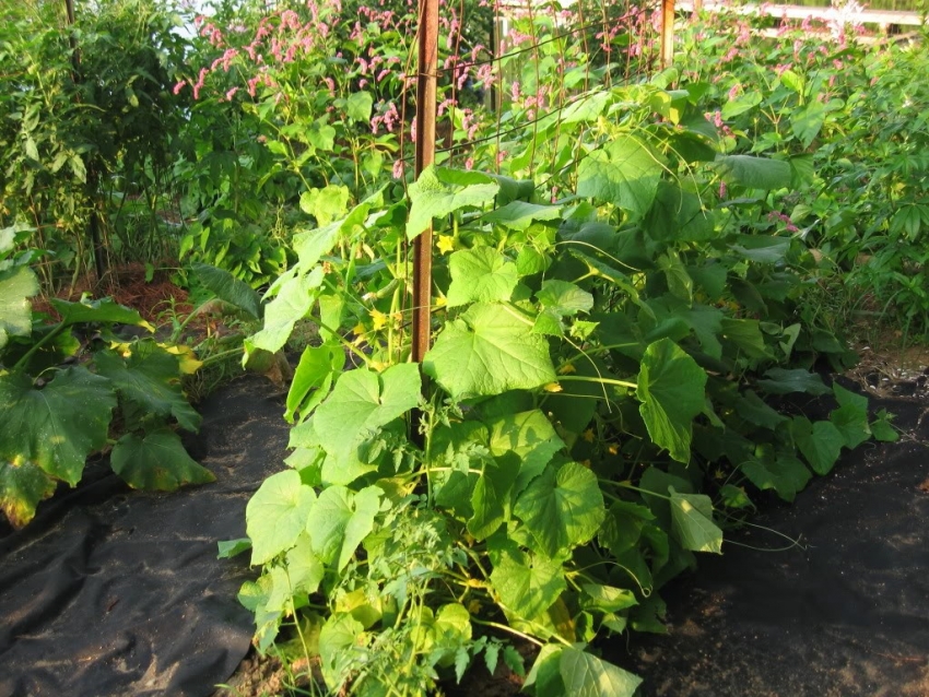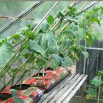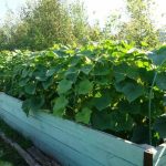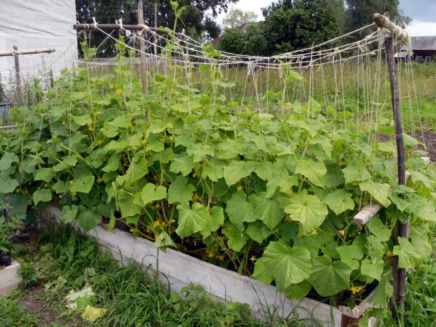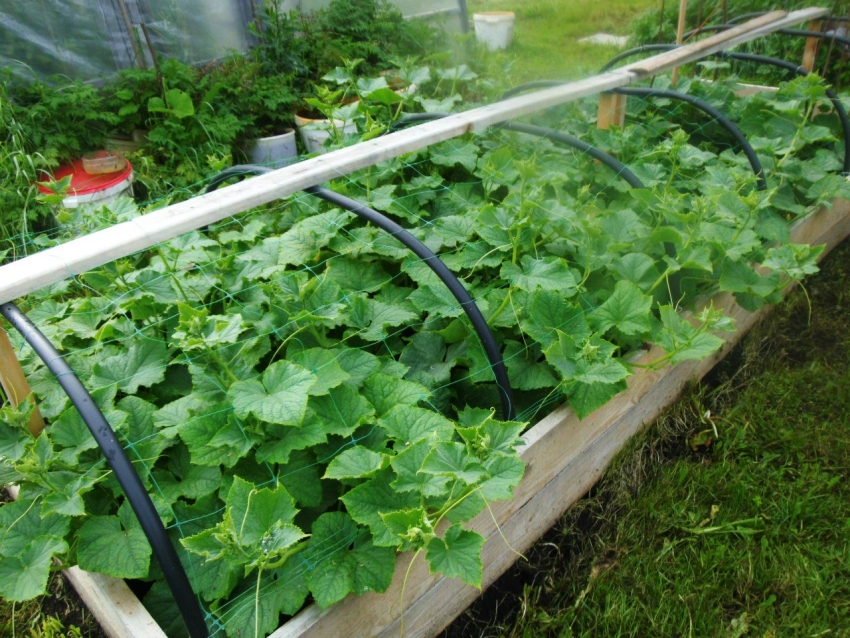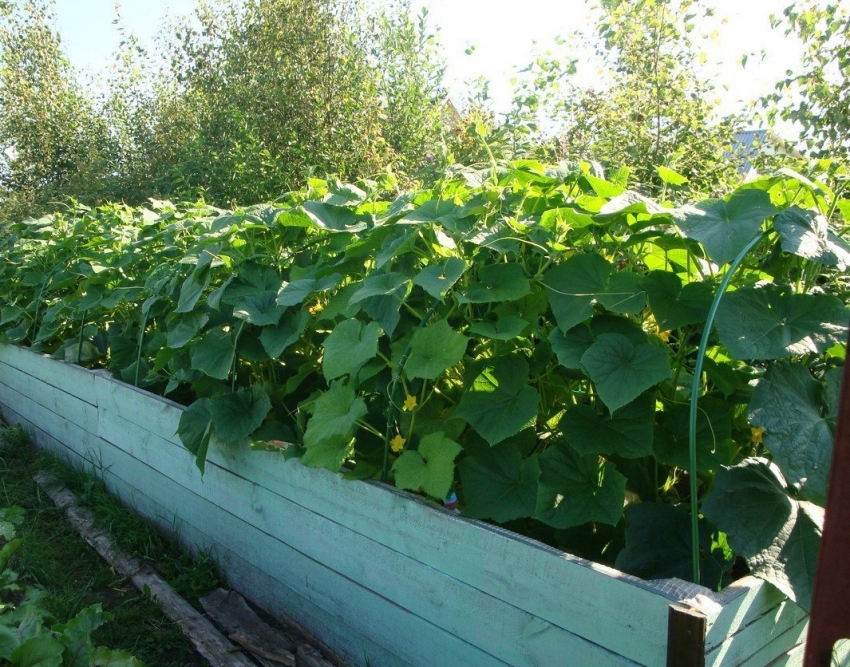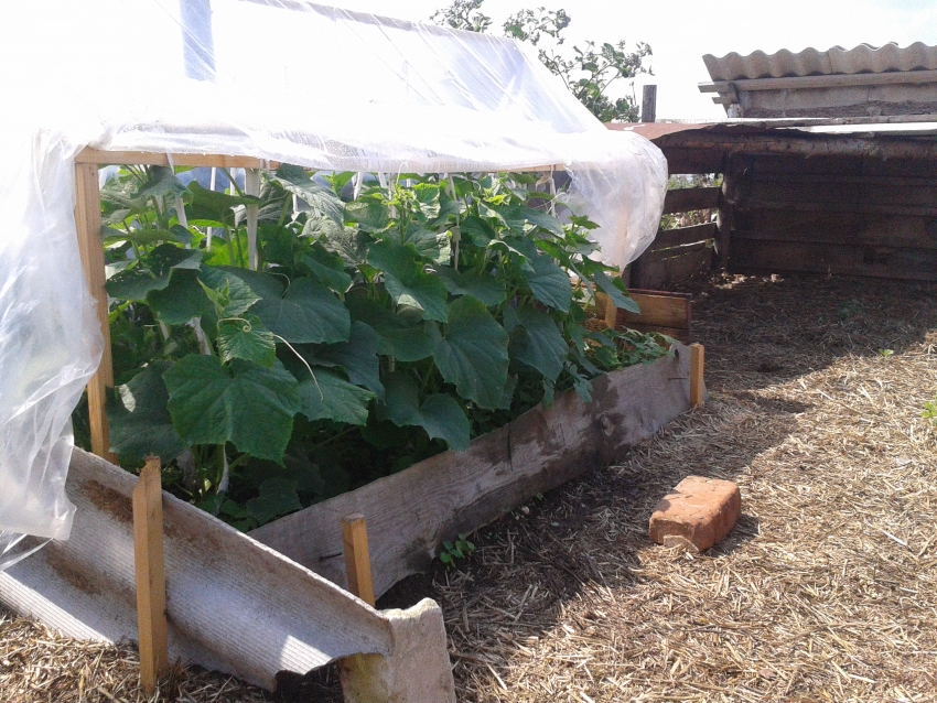 Planting av agurker utføres i to rader. Planter plasseres langs kantene på sengekassen, noe som sørger for tilstrekkelig lysnivå. Hvis det er planlagt å plante agurker tidlig på våren, kan strukturene gjøres om til drivhus. For å gjøre dette må du installere plastbuer og strekke plastfolie over dem. Dermed økes oppvarmingen og en tidlig innhøsting blir mulig. Dessuten er resultatet helt uavhengig av værforhold.
