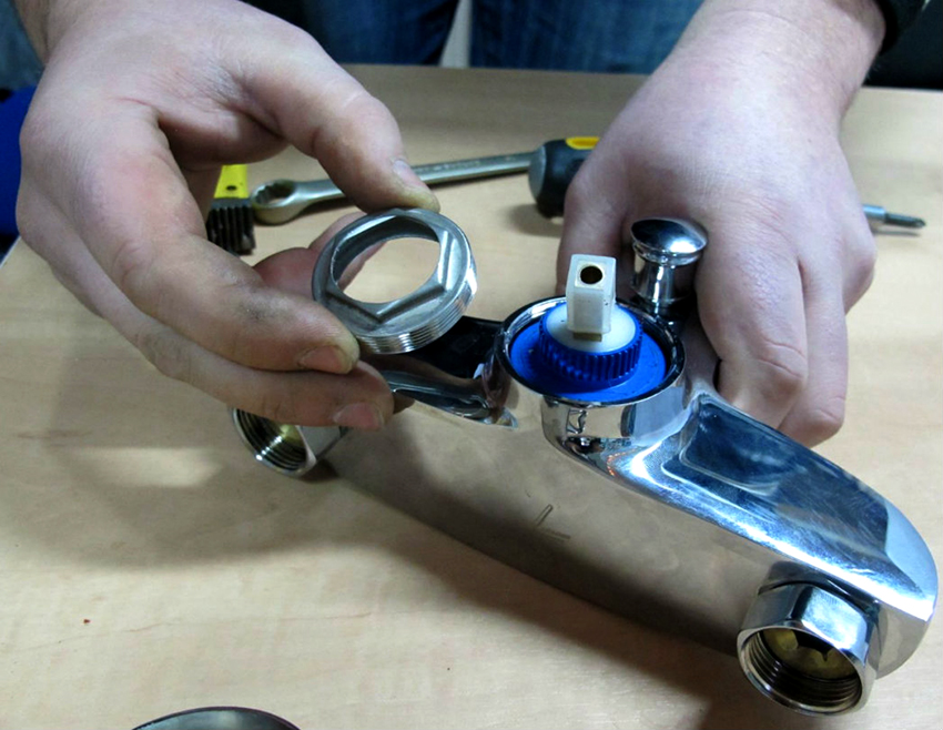 Deretter oppstår spørsmålet om hvordan du fjerner kranboksen. Ved hjelp av en rørnøkkel skrus elementet ut av setet ved å gripe den øvre delen med spesielle hakk. Fremgangsmåten er mot klokken. Deretter må du rengjøre blanderen innvendig.