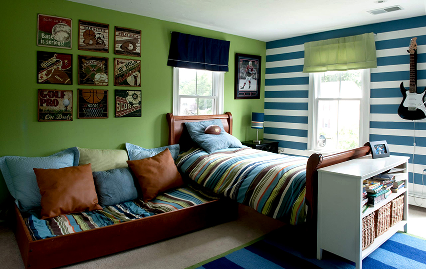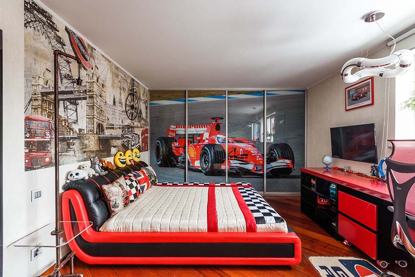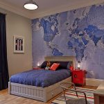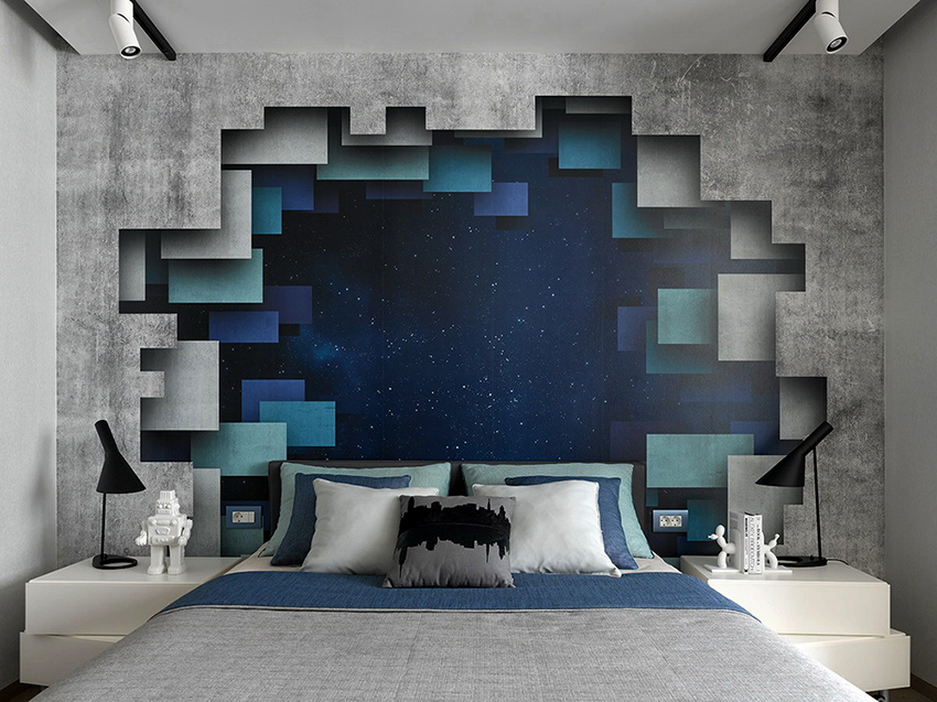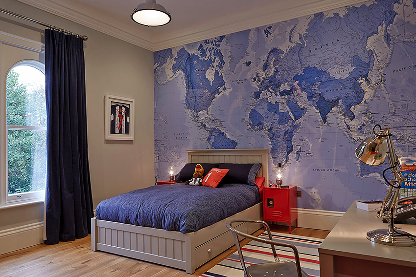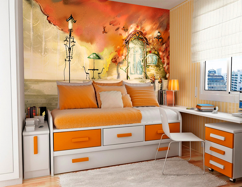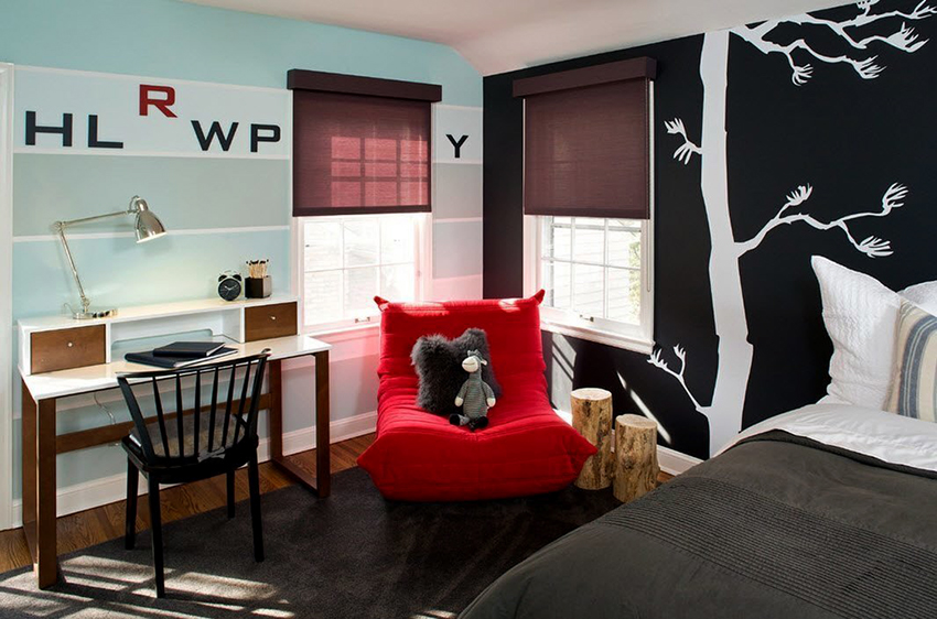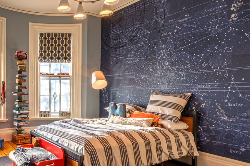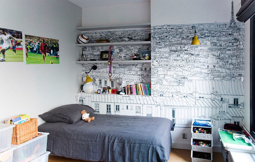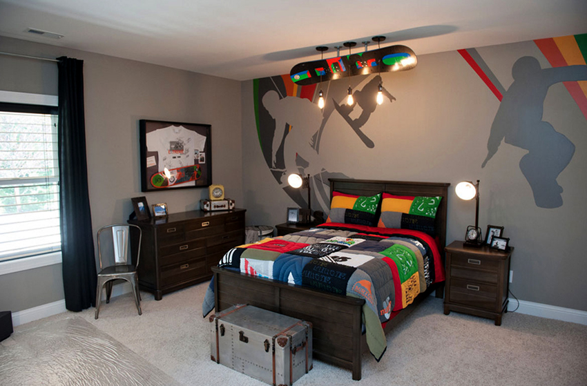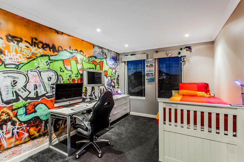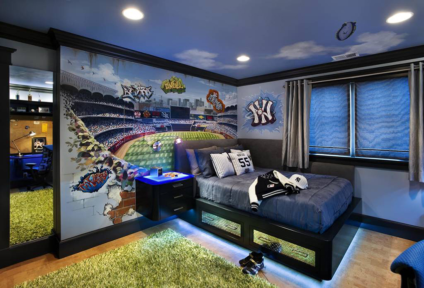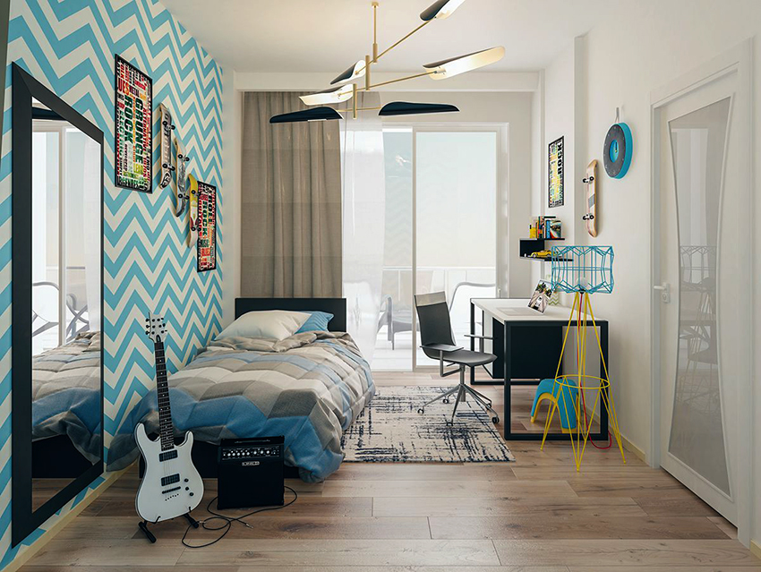 Bakgrunn for et tenåringsrom for en gutt er valgt med tegninger som samsvarer med barnets hobbyer. Typiske illustrasjoner kan brukes her på et av temaene, for eksempel sport, teknologi, musikk, biler, graffiti eller urbane komposisjoner.