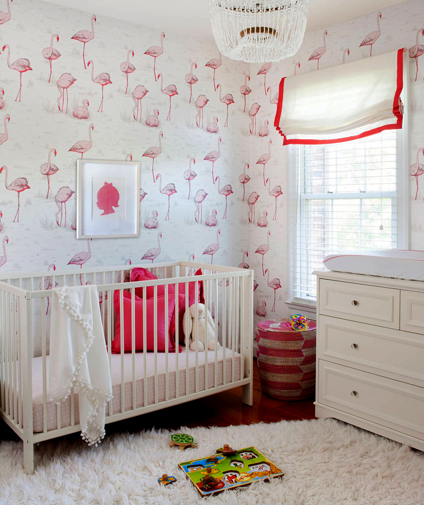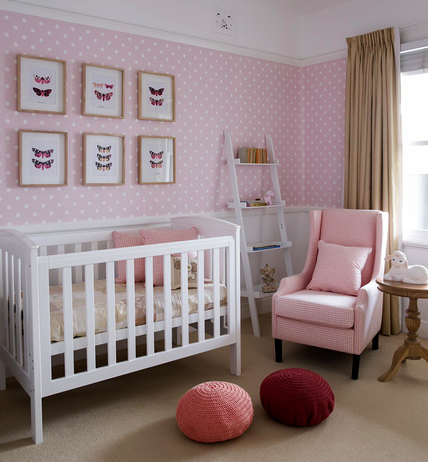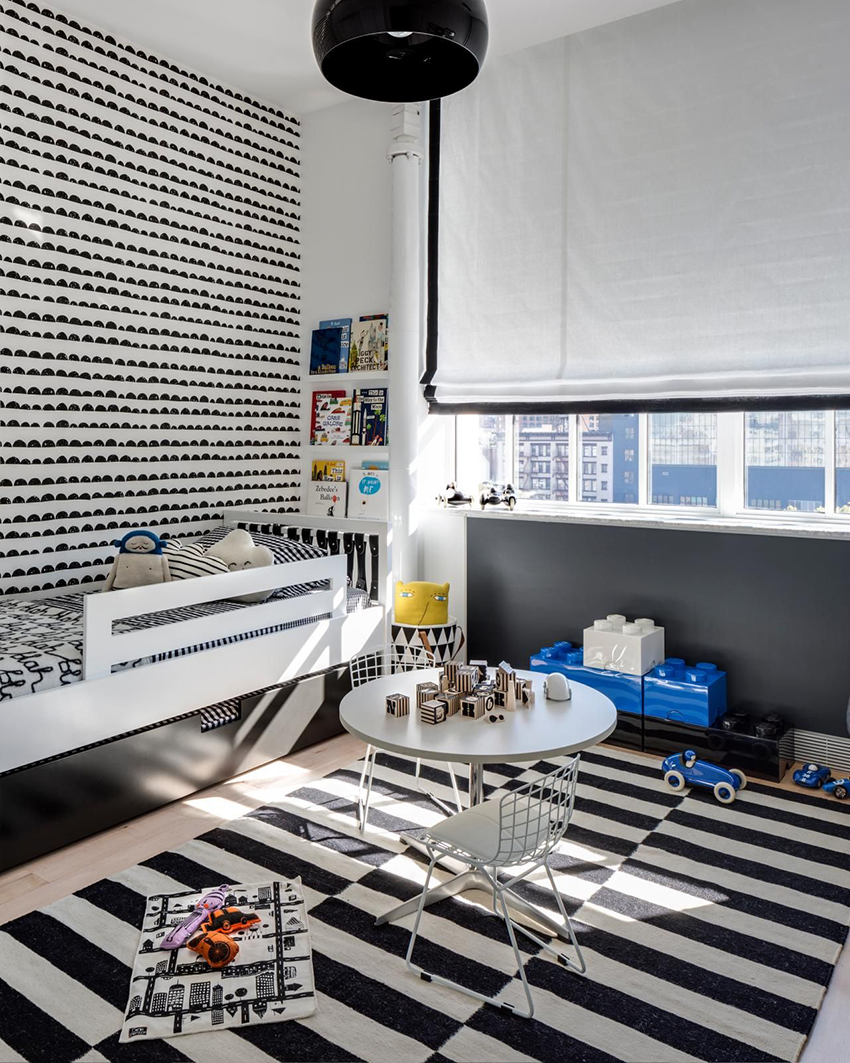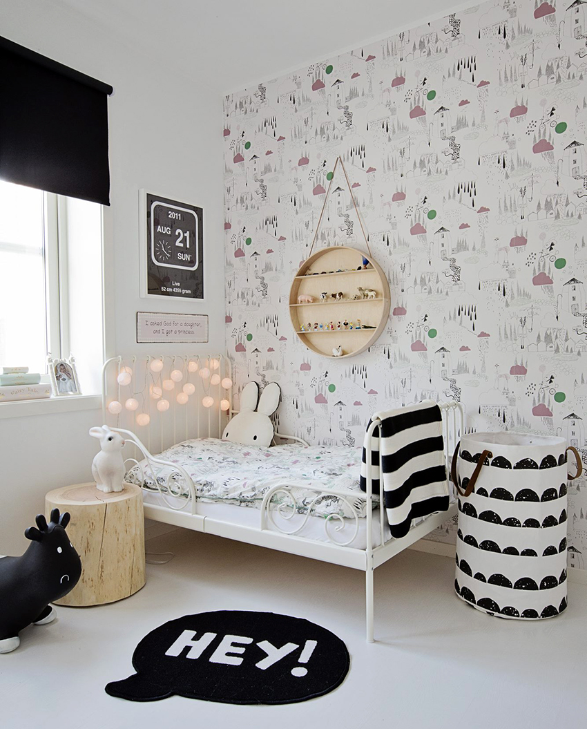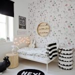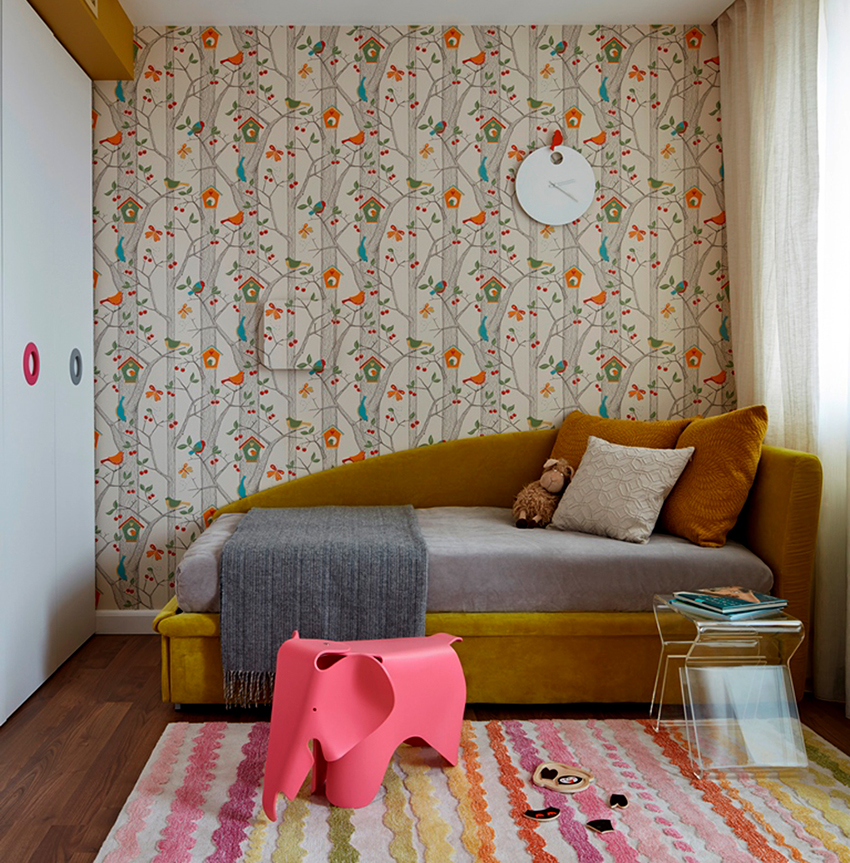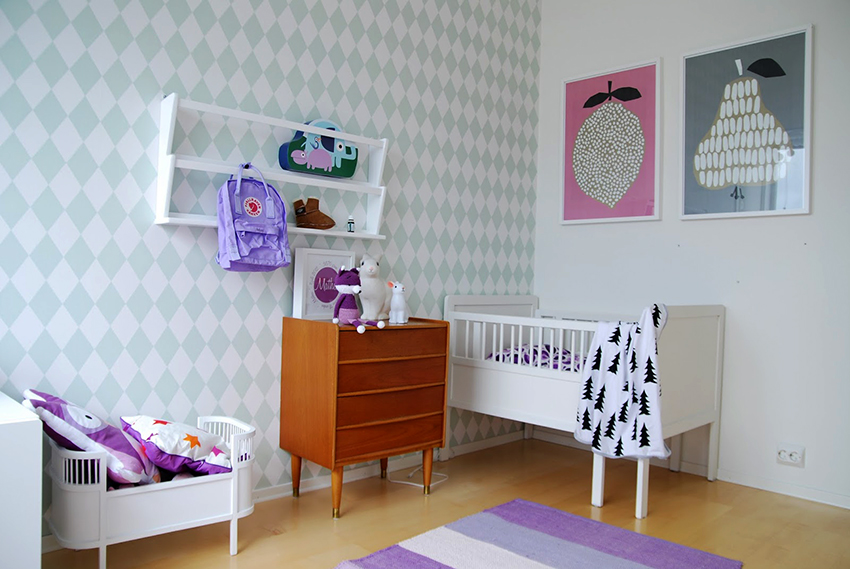Geometriske temaer regnes som universelle, som passer for et barn i alle aldre og kjønn. Geometriske ornamenter kan presenteres i hvilket som helst fargevalg, noe som vil skape en viss atmosfære i rommet. Ruter og diamanter er et symbol på ordenlighet. Rette linjer representerer aktivitet og dynamikk. Bakgrunn med polka-prikker vil tilføre drømmer, romantikk og letthet til interiøret.