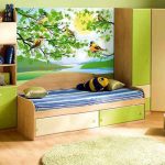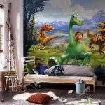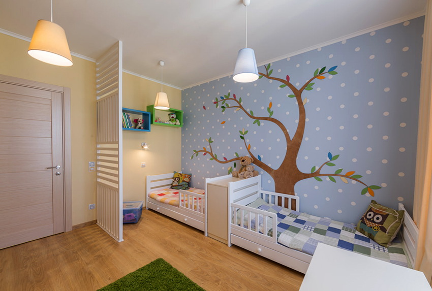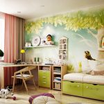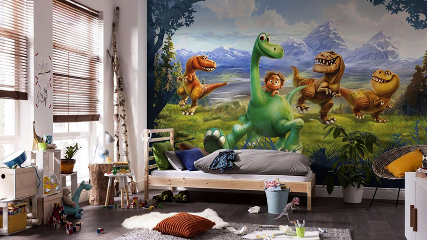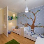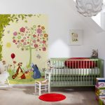 Et enkelt og romantisk alternativ som passer for jenter er produkter med sommerfugler eller blomster. For gutter kan du plukke opp uvanlige bilder på temaet dyreverdenen. Det mest relevante og populære alternativet er overflater med dinosaurer. Et rom med et tre på en av veggene vil se originalt ut. Slike bakgrunnsbilder kan suppleres med klistremerker med bilder av dyr og blomster, og gjør hjørnet til en eventyrskog, som vist på bildet av tapetet i rommet.