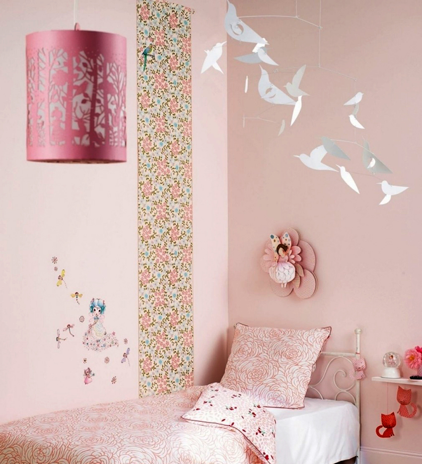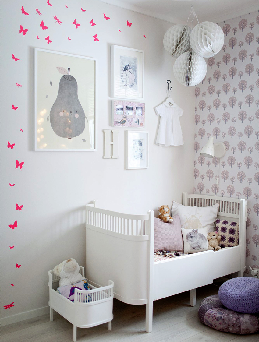 Dekorasjonen av barnerommet skal være orientert mot barnets alder. Hva en 3-åring vil like, er kanskje ikke akseptabelt for en 10-åring. Veggdekorasjon for en nyfødt bør gjøres i en rolig pastellpalett. Lyse farger og fargerike tapetklistremerker i et barnehage med tegneseriefigurer eller andre bilder kan skremme den lille.