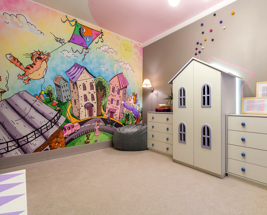 Du kan bruke bilder av ikke bare godbiter, men også uhyggelige karakterer. Denne tilnærmingen vil hjelpe barnet til å bli dristigere. Veggmalerier med en drage er de beste for dette formålet. Hvis han er snill, kan babyen føle seg som i et eventyr.