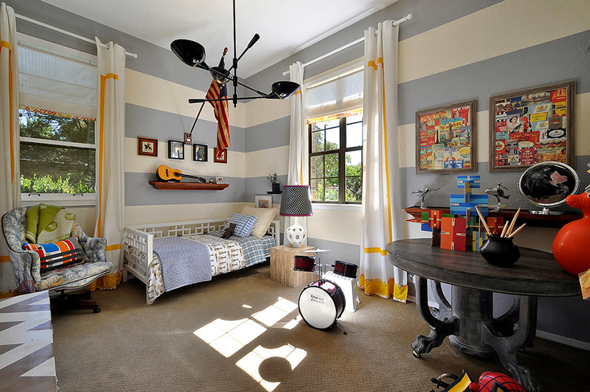 Etter 6 år har barnet venner som det leker aktivt med, noe som kan føre til skade på veggbelegget. Det mest berettigede alternativet i dette tilfellet er bruk av flytende tapet, som lar deg raskt rette opp feil. Det er bedre å velge finish i et monokromatisk rolig design, for ikke å overbelaste barnet unødvendig, som er overfylt med informasjon i denne perioden. Psykologer anbefaler å dekke veggene med stripete tapeter med et mønster i barnehagen, som gjør at babyen kan konsentrere seg.