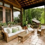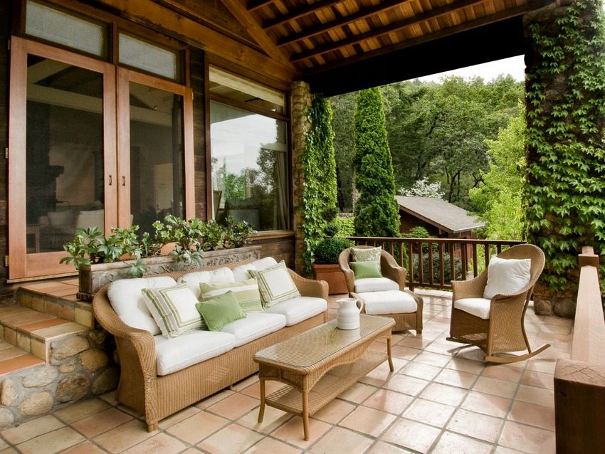 Verandaen er skapt romslig og lett. Møblene som er plassert i den skal ikke forstyrre åpningen av vinduer. Lett kurvmøbler i rotting ser passende ut.