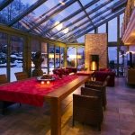 Med tanke på treets utmerkede evne til å kombinere med andre naturlige materialer, vil en peis foret med naturstein være harmonisk i en treveranda. Det vil ikke bare ha en dekorativ og estetisk funksjon, fordi det i kaldt vær er så hyggelig å sitte ved peisen og knitrende av tre.