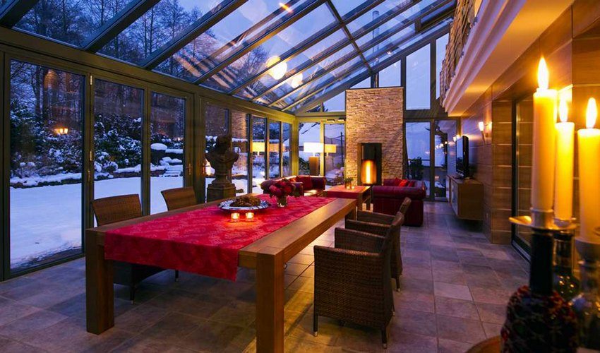 For at temperaturen i verandaen skal forbli behagelig i den kalde perioden, anbefales det å bygge veggene av et tett materiale, og sørg for at de omsluttende konstruksjonene er laget uten hull og sprekker. For å beholde varmen er glasset dobbelt.
