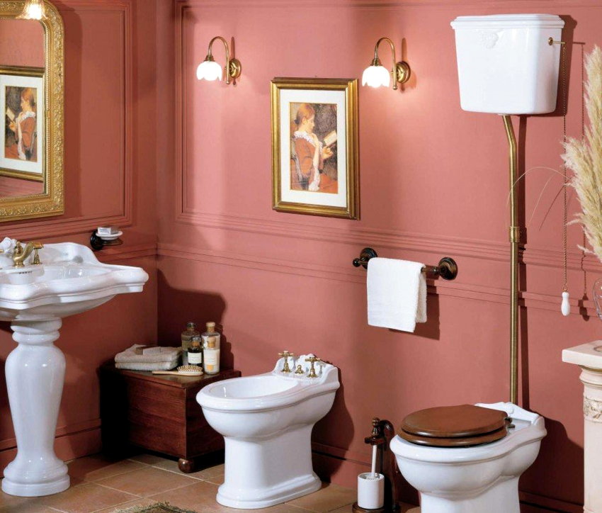 Når du dekorerer et bad i en moderne stil med bruk av gammeldags etterbehandlingsmaterialer og tilbehør, vil et gulvapparat med hengende sistern for et toalett innebygd i en nisje se mest organisk ut.