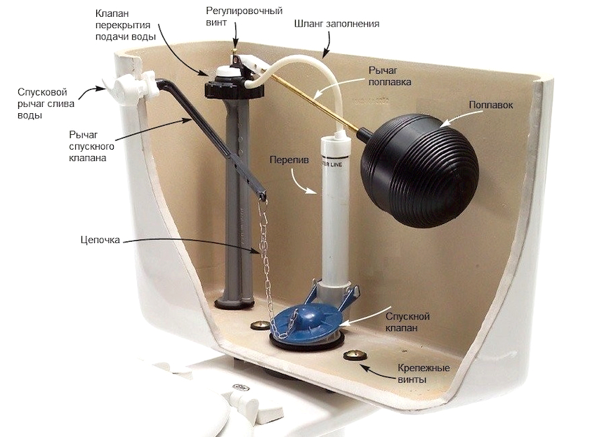 Det moderne toalettspylingssystemet består av en avstengningsanordning, en påfyllingsventil og et system som forhindrer overløp av vann. Et slikt kompleks av elementer kan fremstilles som en solid struktur eller bestå av separate deler.