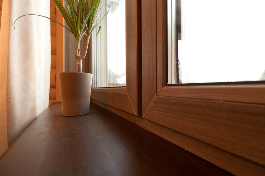 Le rebord de fenêtre en plastique peut être fabriqué en blanc, couleur et grain de bois. Cette dernière option trouve son application dans les maisons en bois. Il peut également être utilisé en tandem avec des fenêtres en bois. Cependant, une telle structure, contrairement à un rebord de fenêtre en bois, est caractérisée par une résistance à l'humidité, un manque de traitement pour une opération ultérieure et une longue durée de vie. L'effet imitation bois est obtenu en utilisant un film laminé approprié.