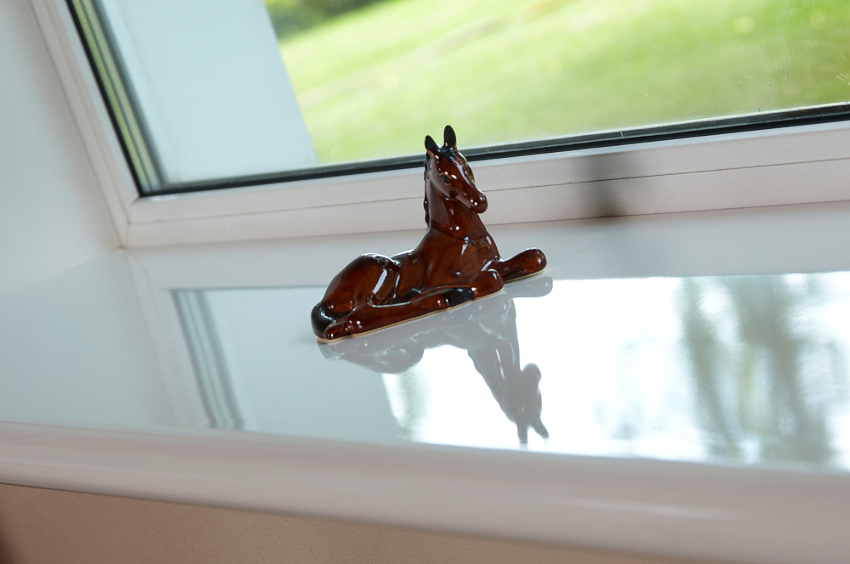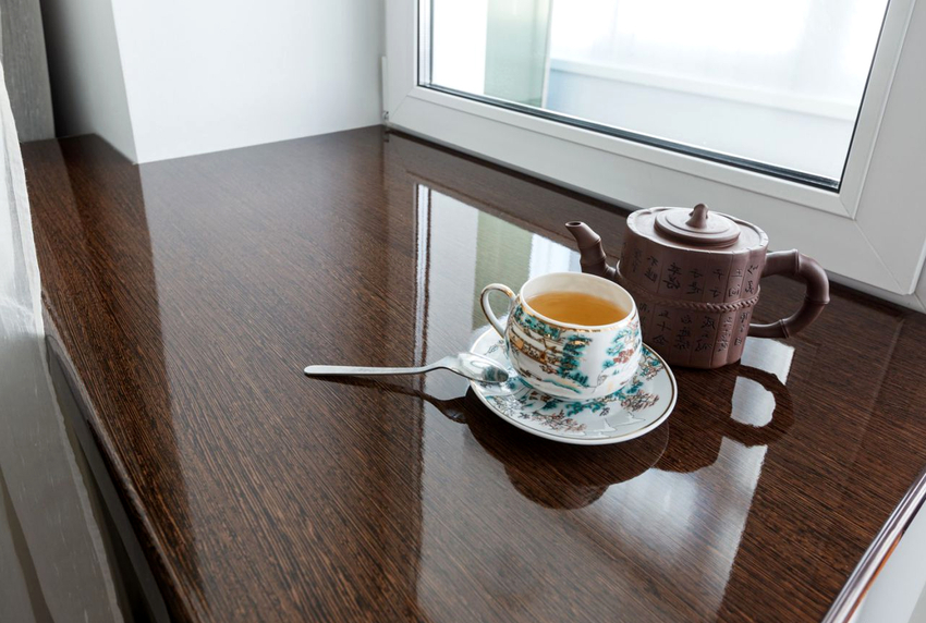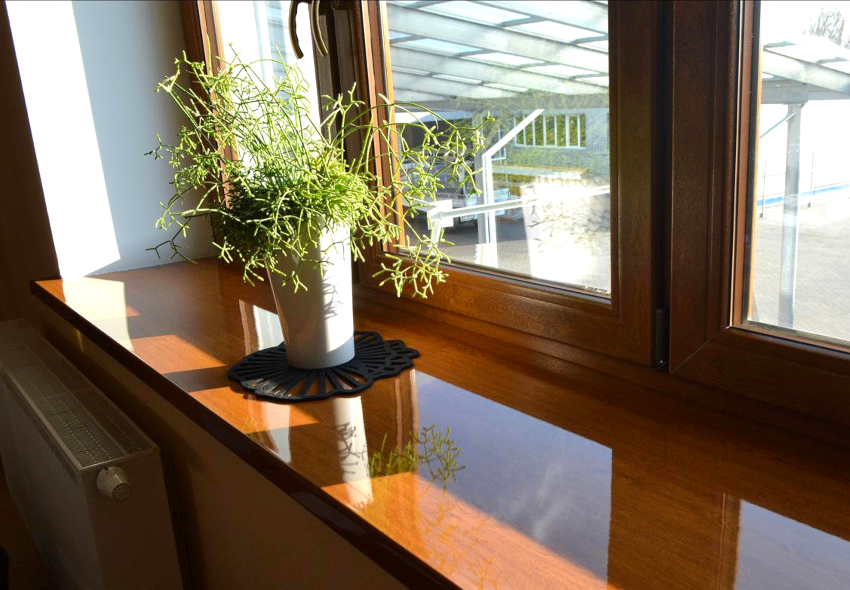 Un produit brillant a une apparence plus attrayante. La surface a des propriétés antistatiques, de sorte que la saleté et la poussière ne s'y accumulent pas. Le produit est plus facile à entretenir. Cependant, la surface est sensible aux contraintes mécaniques; de petites rayures visibles se forment rapidement dessus, qui dégradent son aspect. De plus, le rebord de fenêtre brillant ne se prête pas à la restauration.