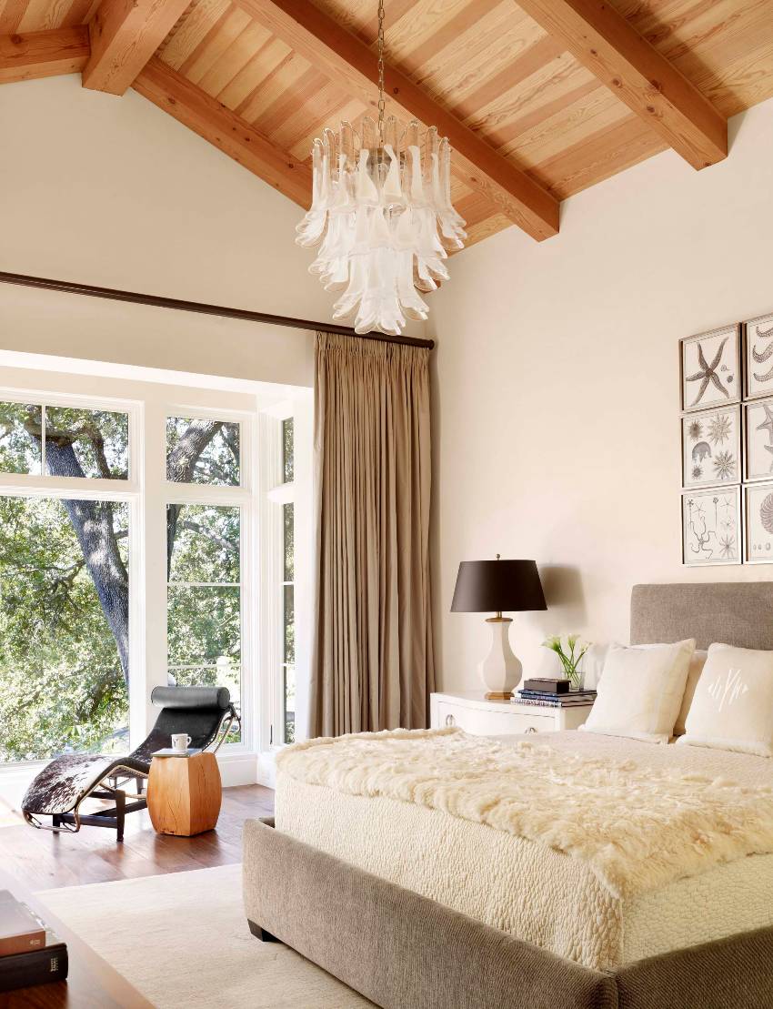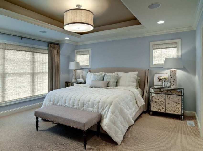 Sufit w sypialni nie powinien być wizualnie ciężki. Tego wymogu należy przestrzegać aranżując oświetlenie we wnętrzach o dowolnym stylu.