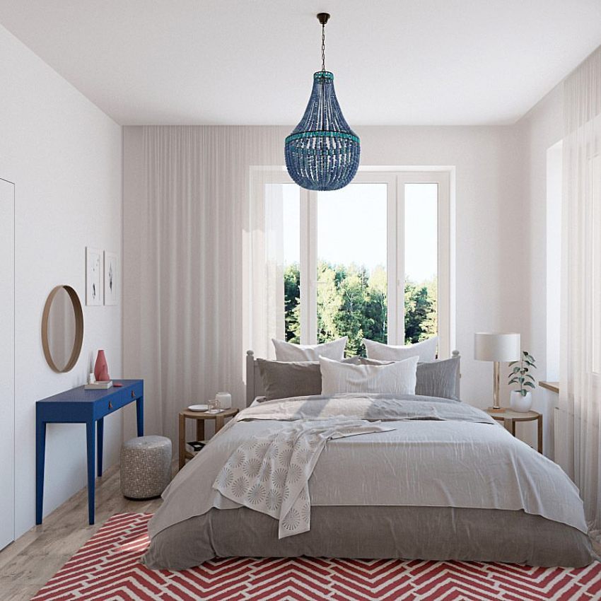 Jeśli w sypialni jest miejsce do pracy, jeden żyrandol nie wystarczy do oświetlenia całego pomieszczenia.